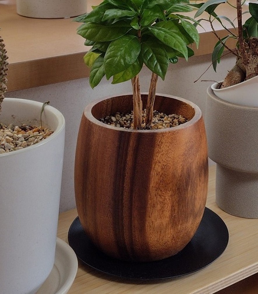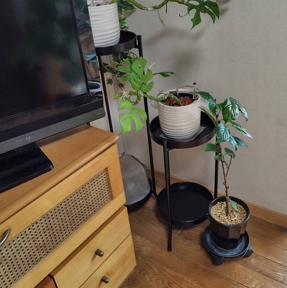 わが家では、テレビ横に観葉植物を置き、鉢受け皿を黒にしました。