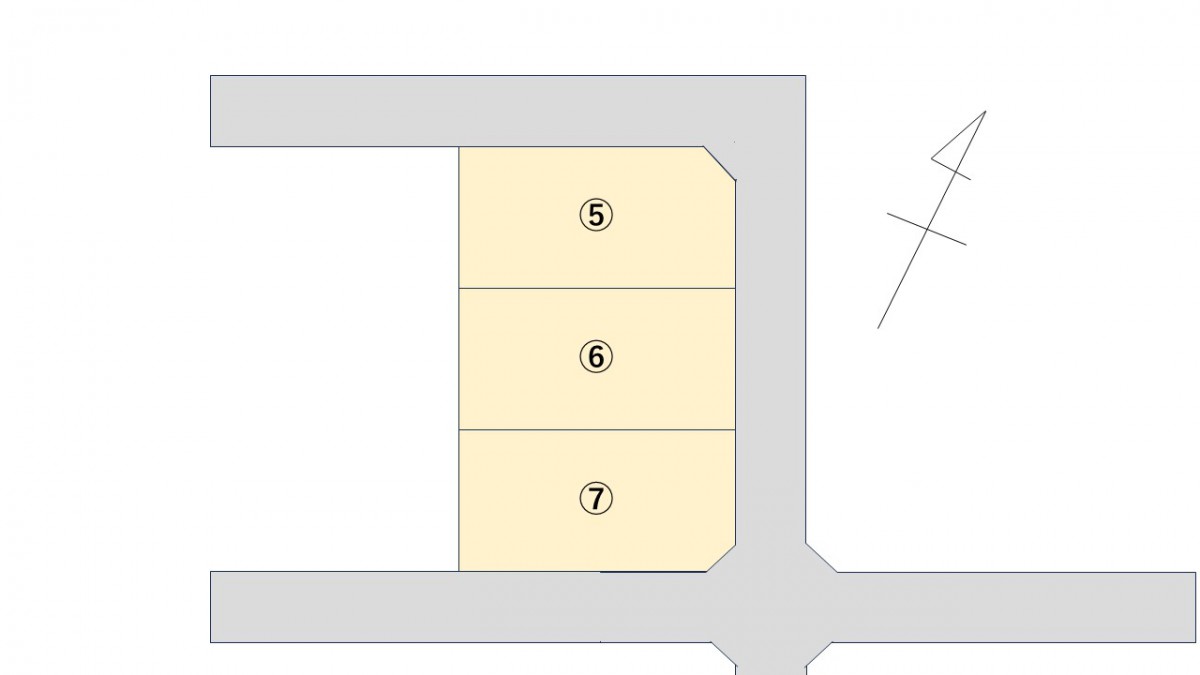 公道幅員北西・北東・南東共に約6m、⑤接面北西約17.2m、北東約9.5m⑥接面北東約10.9m⑦接面北東約9.5m、南西約17.2m