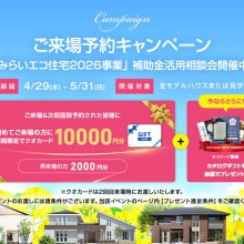 ・期間限定キャンペーン期間中2回目以降のご来場は通常の来場キャンペーン(各モデルハウスへの初めてのご来場ごとに500円)が適用されます。