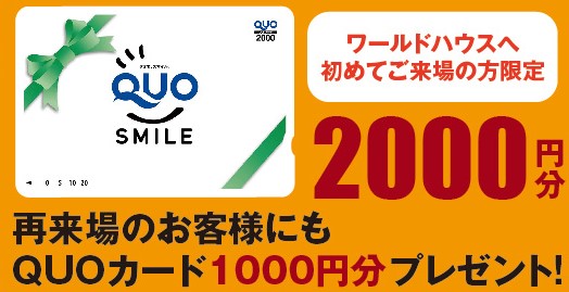 ホームページからのご予約で、初めてワールドハウスをご見学の方にQUOカード2000円分プレゼント!