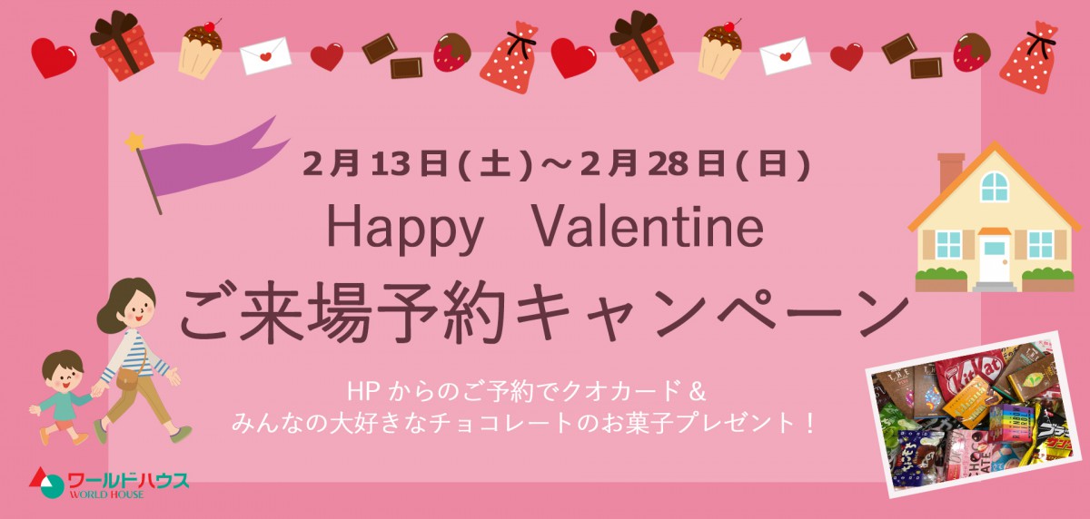 2月13日(土)~2月28日(日)に、ワールドハウスのホームページからご来場予約して来場されたご家族にみんなが大好きなおなじみのチョコレートお菓子&クオカード500円分プレゼントいたします。