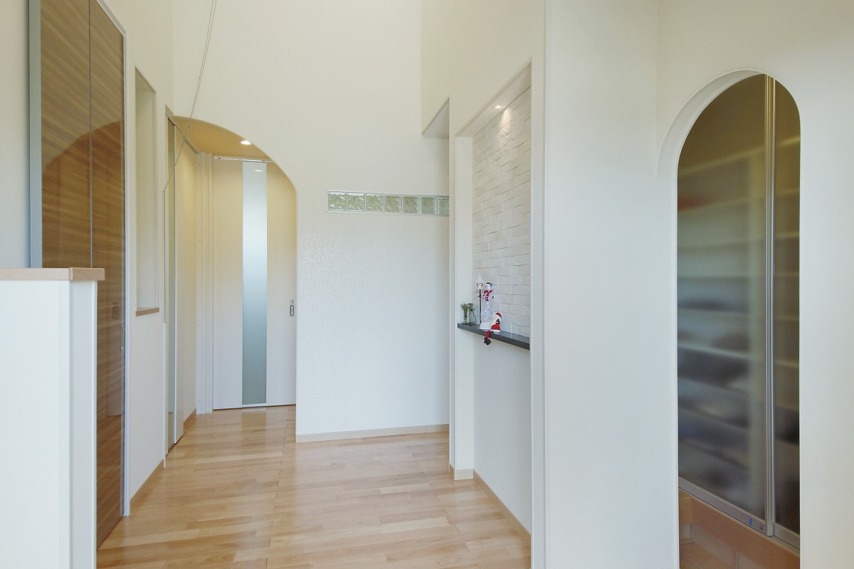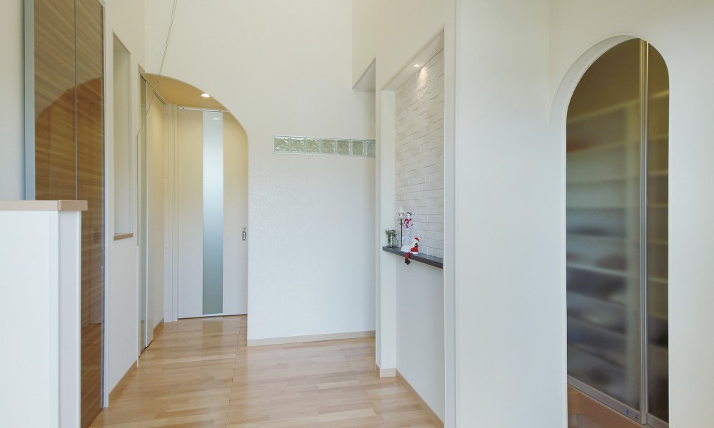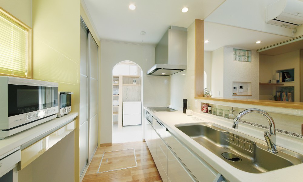 キッチン横のアーチ開口の向こうは明るく広々とした水回りで家事のしやすい動線に