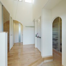 玄関は家の顔。吹き抜けで開放的なゆとりの空間に。左手は家族のシュークローゼット