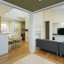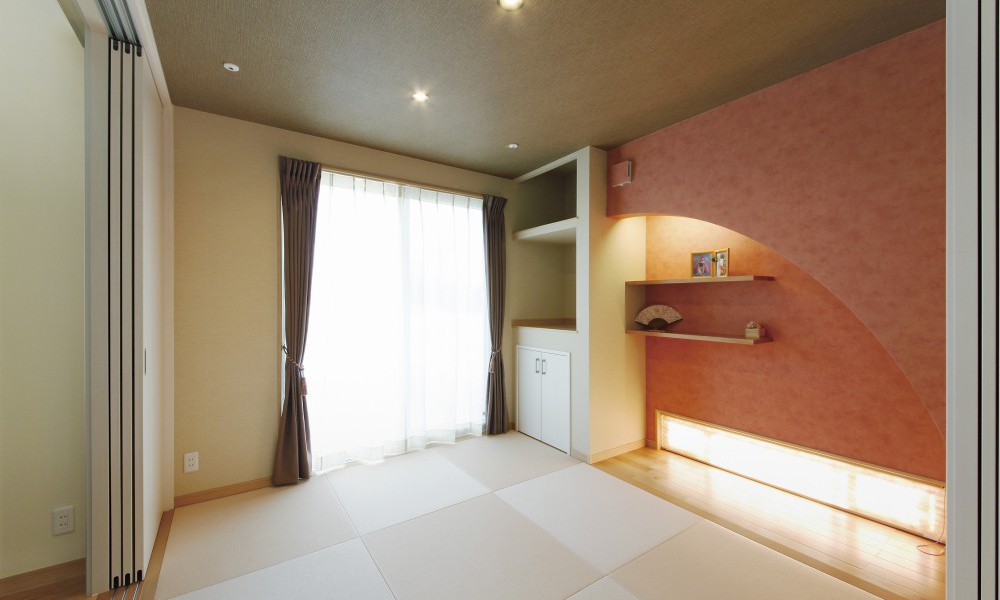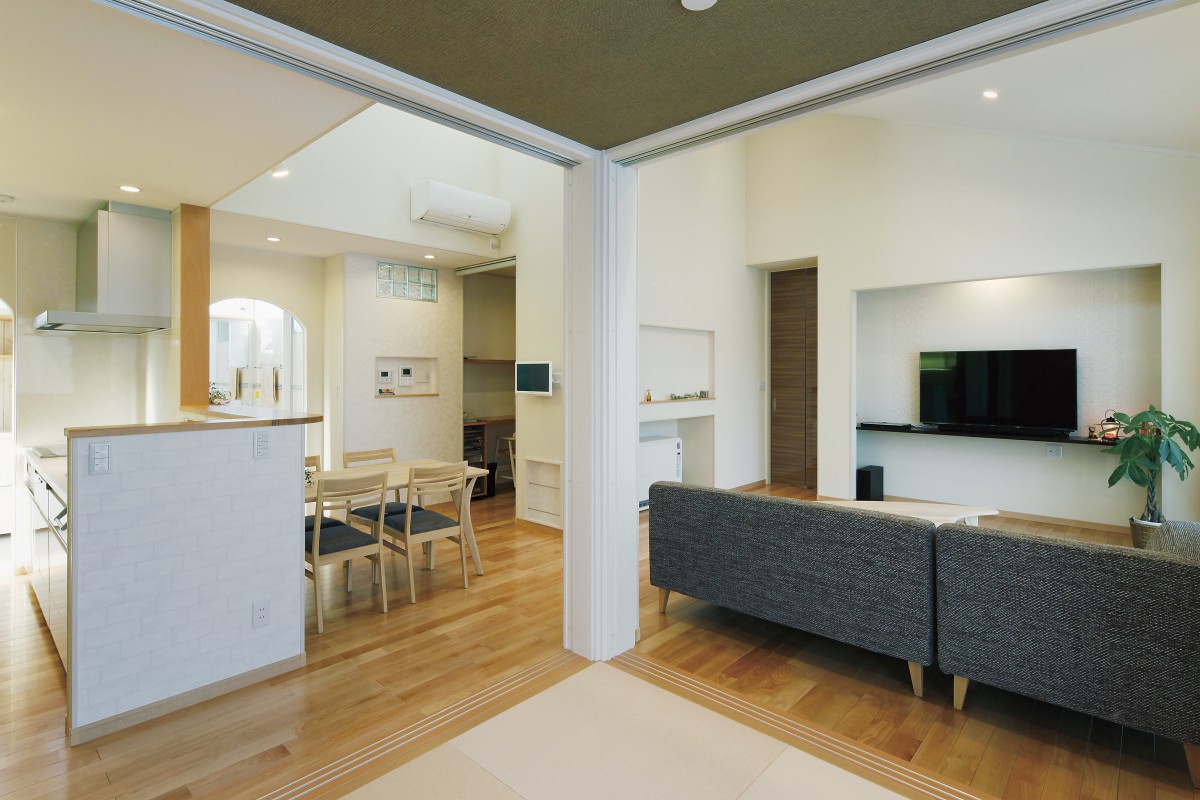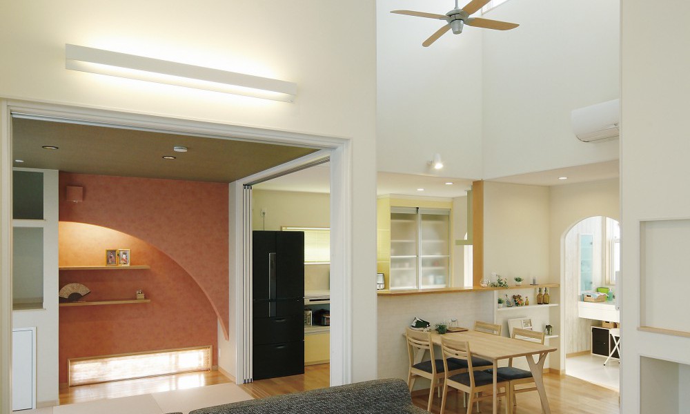 勾配天井を活かしたリビングは高窓からの光が届き、明るく開放的。隣接した和空間はアーチの下がり壁とアクセントクロスで印象的に。個室として利用できるよう仕切り戸もついています。