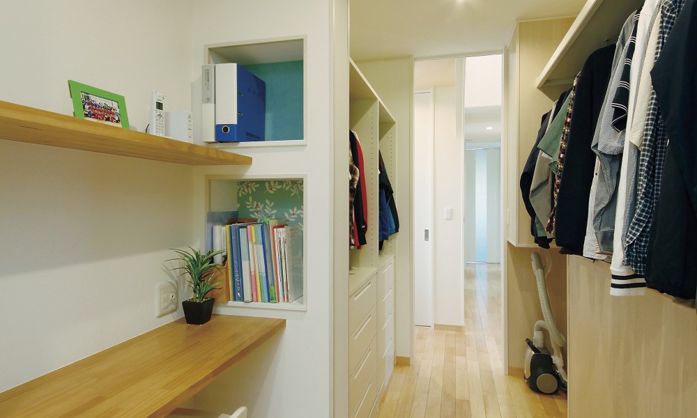 端から端まで見通せる動線上に、家事スペースも兼用したファミリークローゼット。
