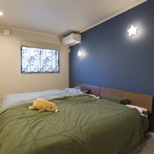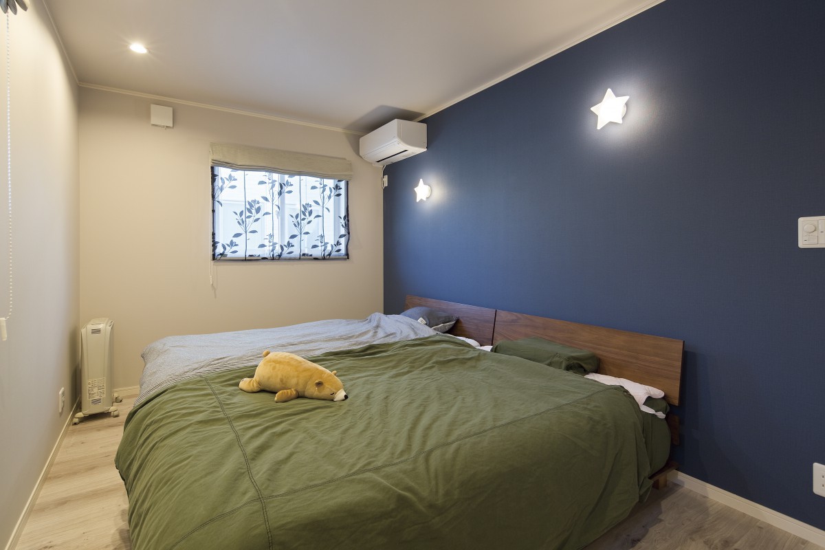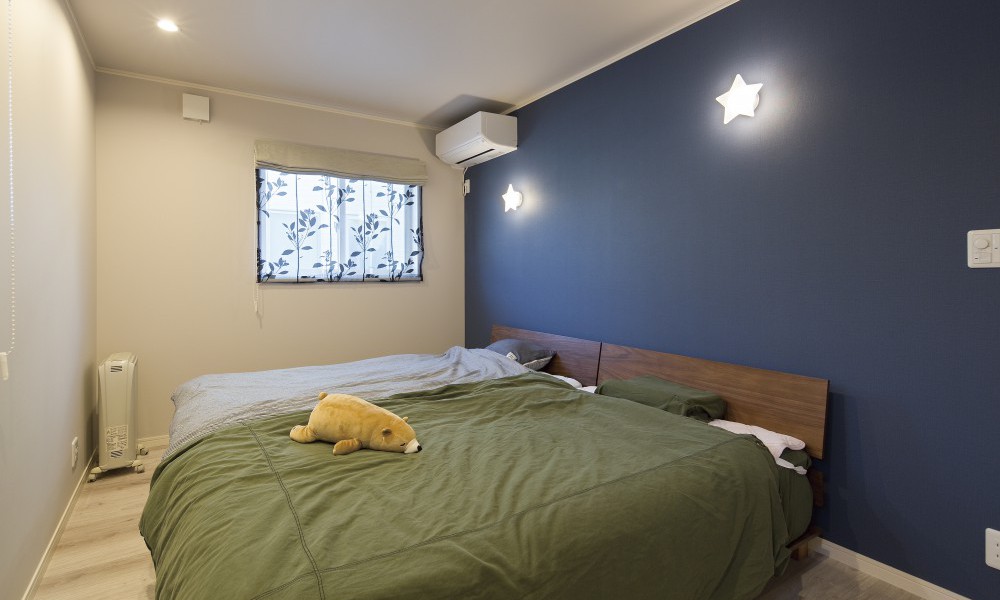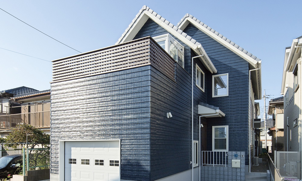 ブルーの外観が印象的な住まい。趣味のサーフィンやキャンプ道具がしまえ、雨にも濡れずに車に乗り降りできるガレージはオーナー様の必須条件