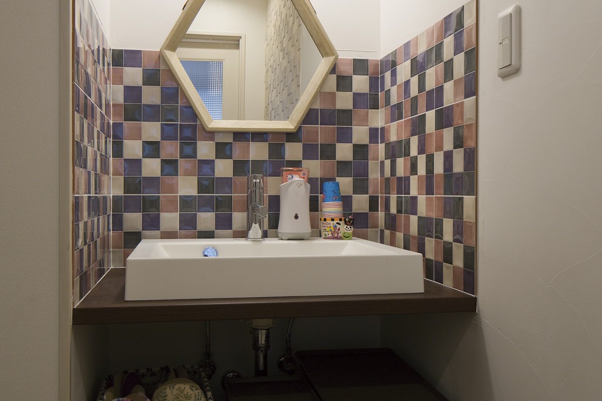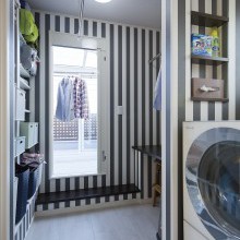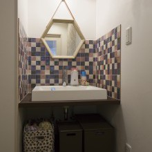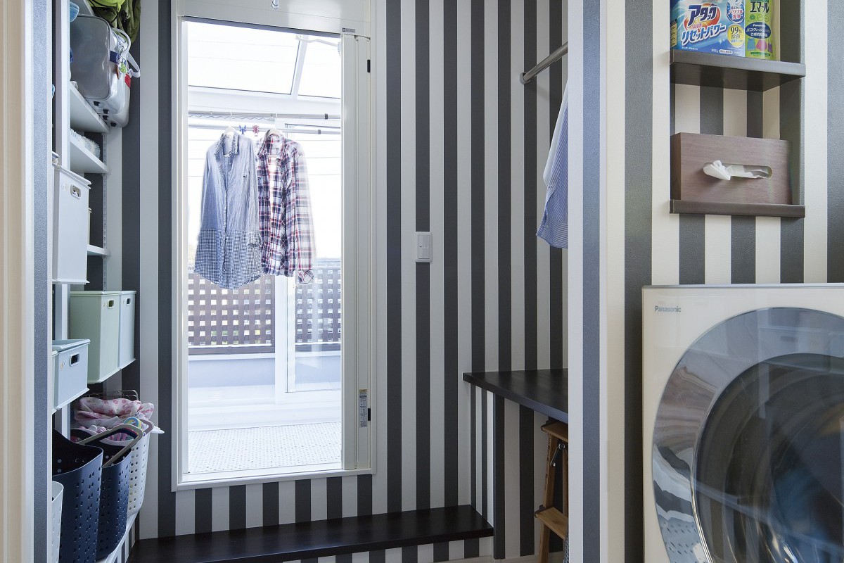 水廻りは2階へ配置して、ストレスのない洗濯動線を実現。ベランダへ直線でつながるランドリースペースは、短い動線で「洗濯・干す・たたむ・アイロンがけをする」ができるこだわりの空間。ポイントは、洗濯家事の一連の動作がここで完結できること。気分を上げてくれるボーダーの壁紙やお気に入りの小物を置いて、自分だけのこだわりの家事室に。