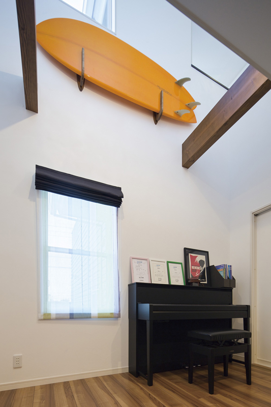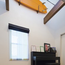 吹き抜けには趣味のサーフボードを掛けて、インテリアの一部に光がいっぱい差し込み明るく開放的なリビング。床の木質感と漆喰の塗壁が美しく調和