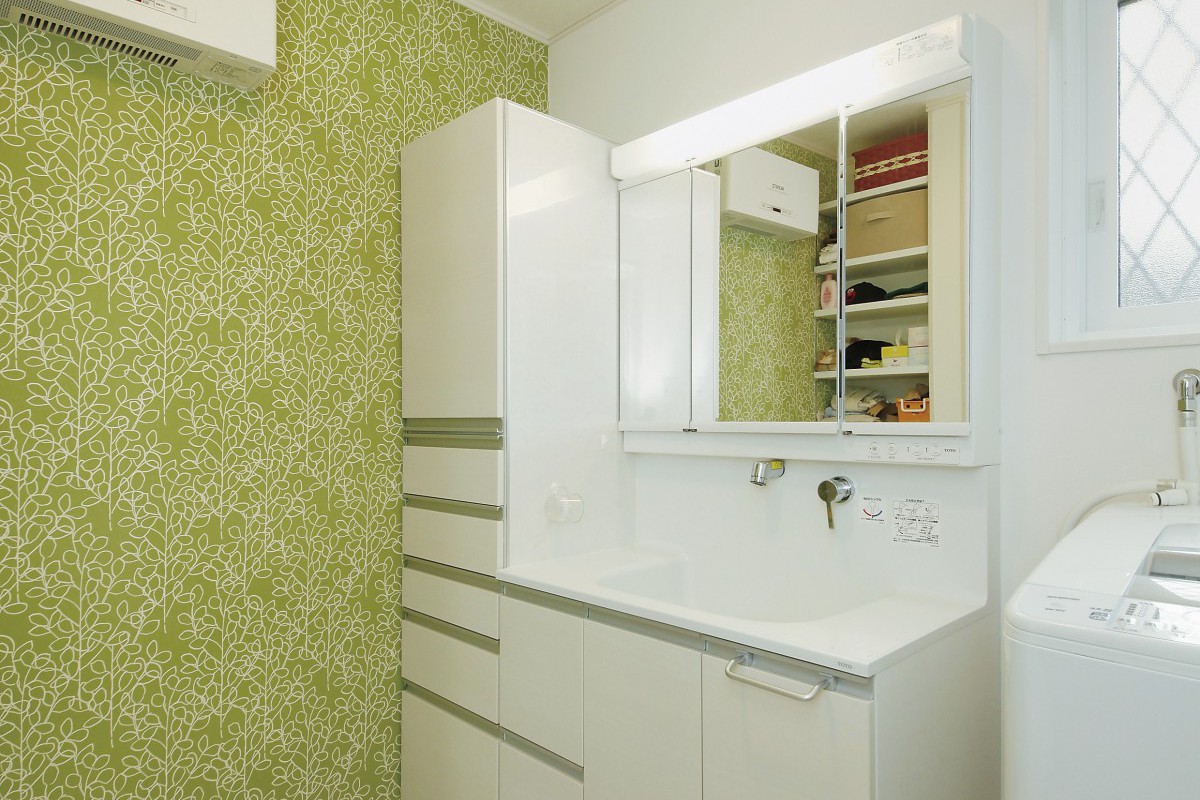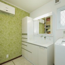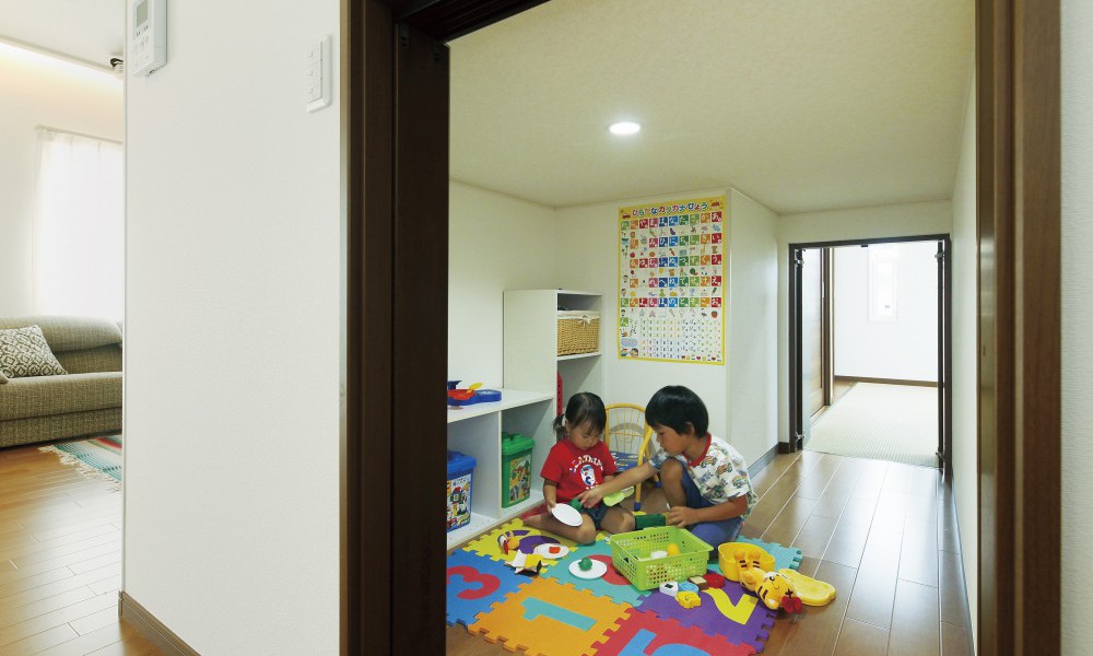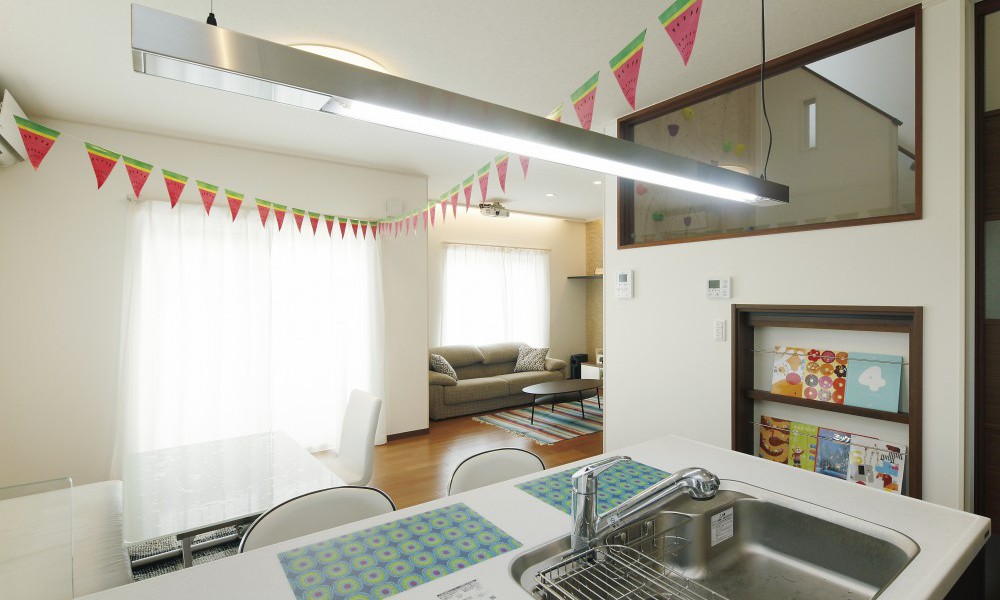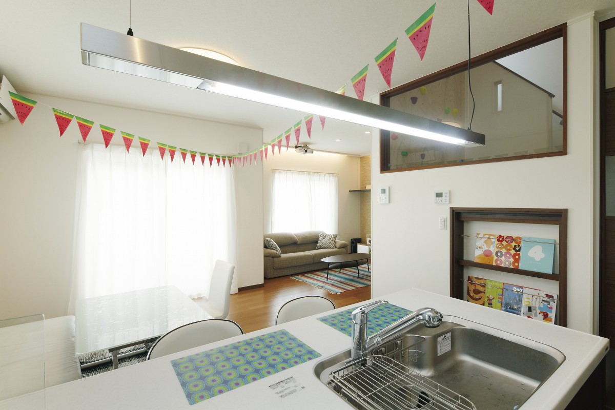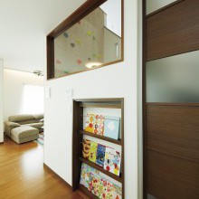 オープンなキッチンや踊り場の窓は家族の様子に目が届く。納戸の周囲を回遊できる動線踊り場下のマガジンラックを開くと納戸が。DKと和室の2方向から出入り可能な家の中心