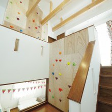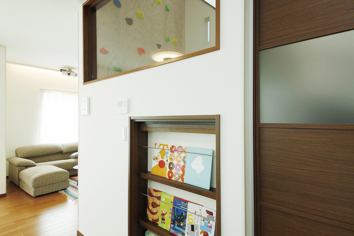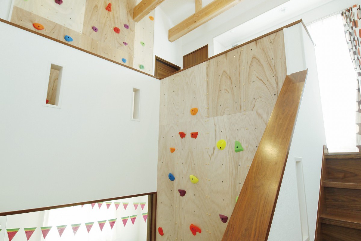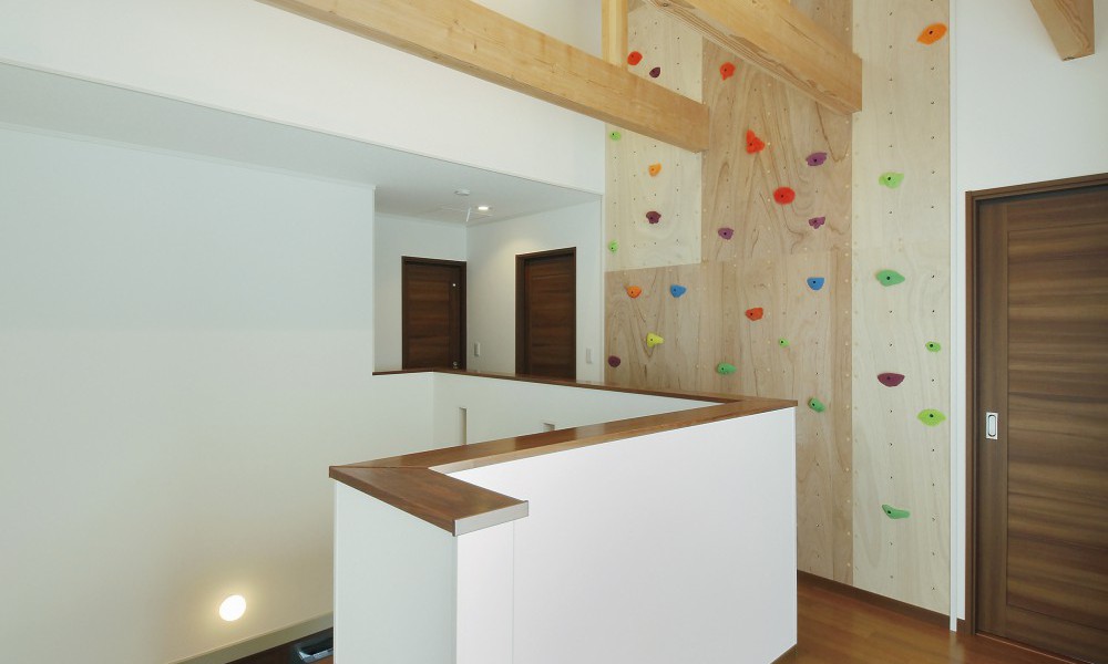 ボルダリングができる壁は、友人ファミリーの子どもたちにも大人気。踊り場下の納戸は2方向から入れて、動線や風通しもよく、工夫の効いたオープンな空間を実現