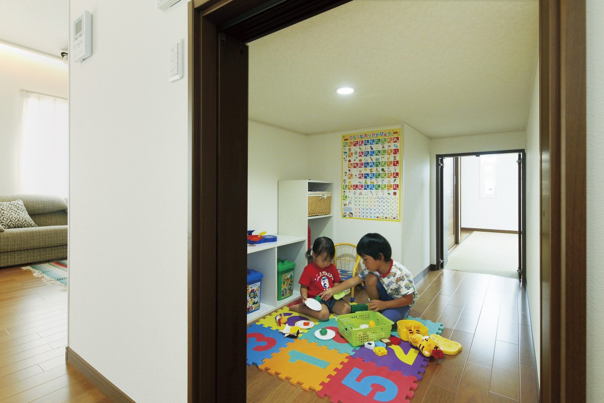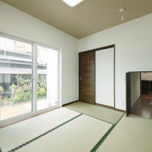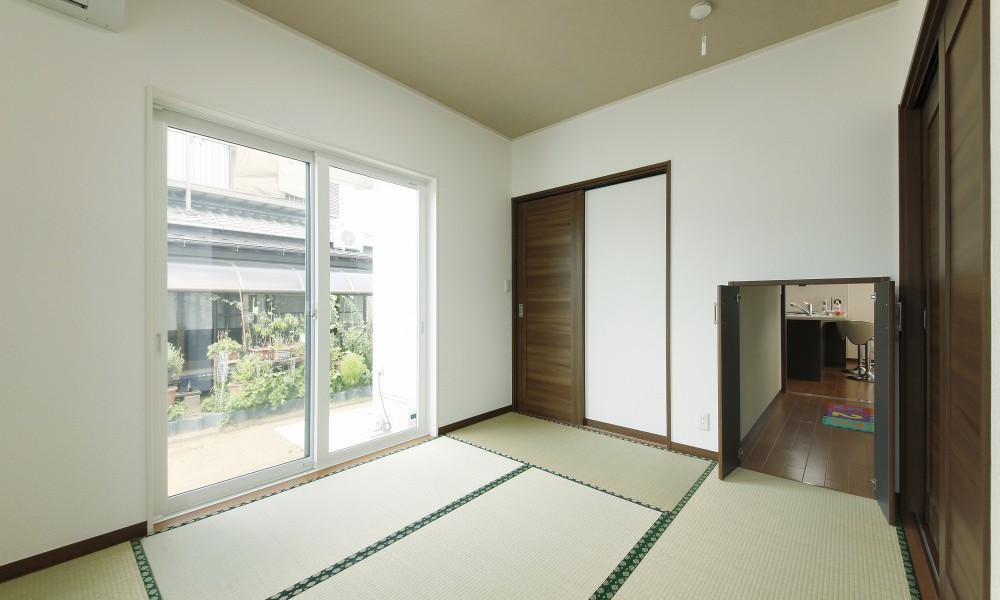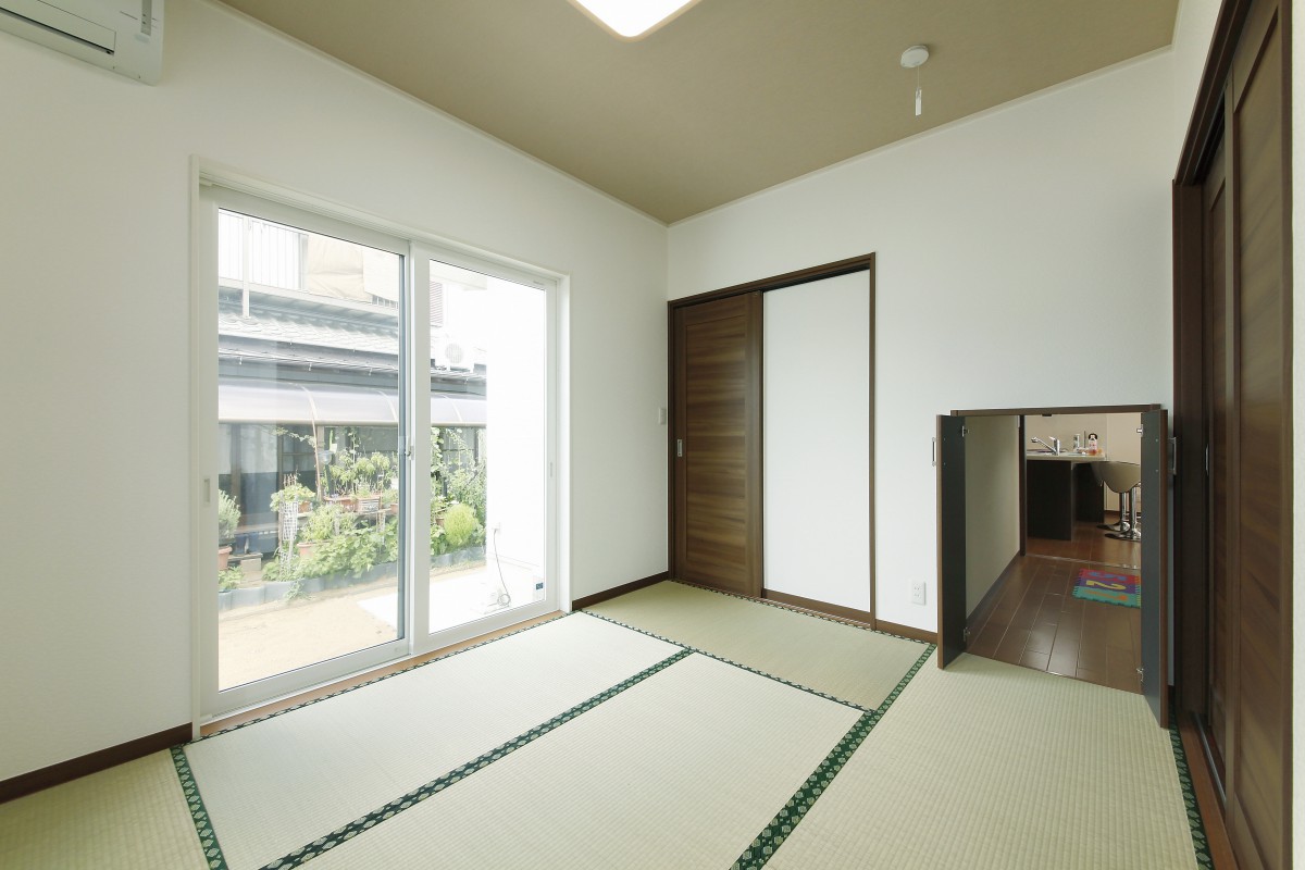 玄関ホールから続く和室は客間としても利用できる。右の納戸を通ってDKへと抜けられる