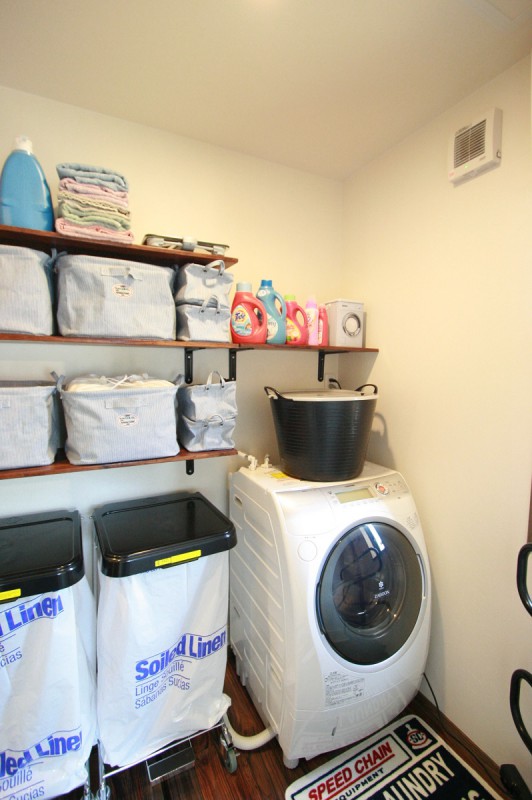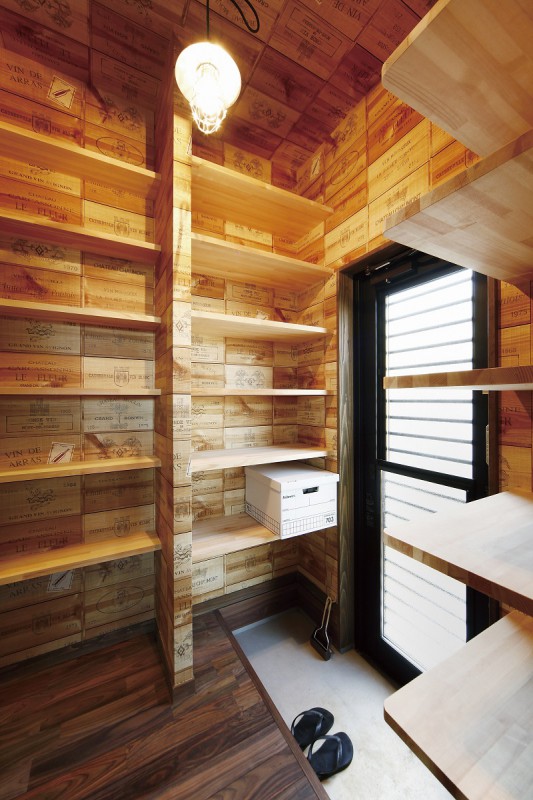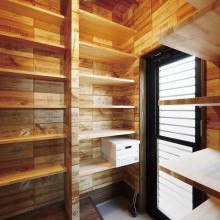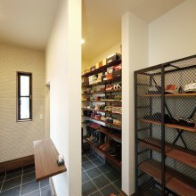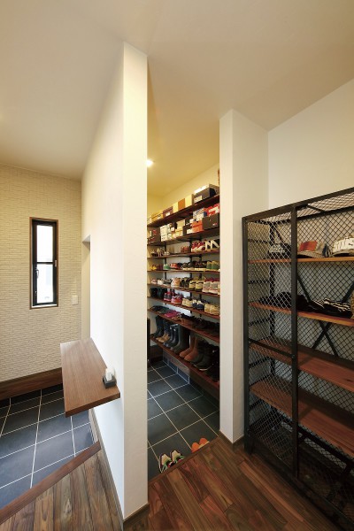 玄関には2ウェイの動線を設け、来客の際もすっきり美しい玄関が保てるようにしている。シューズクロークの棚はN様が探したこだわりの部材を採用しています。