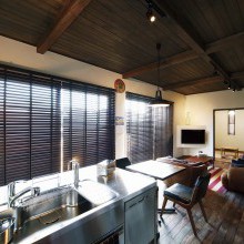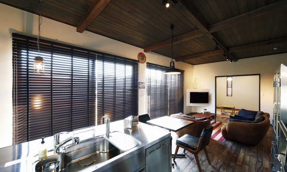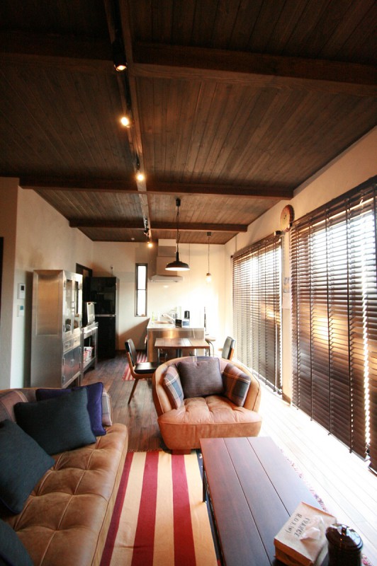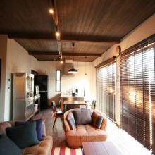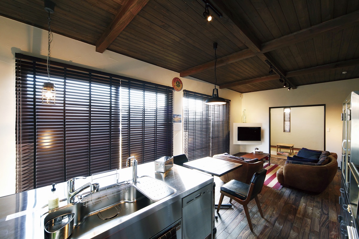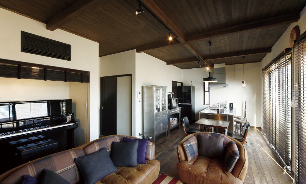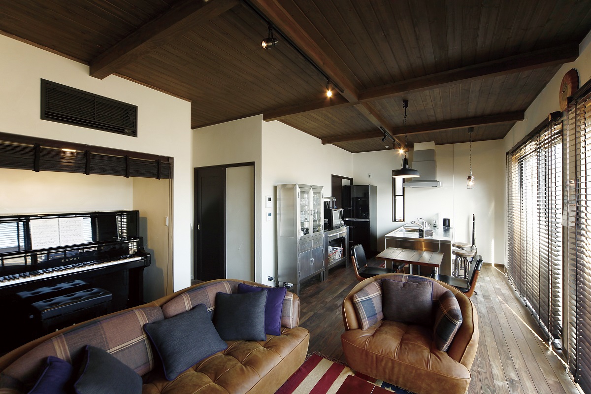 ローズウッドの無垢材が印象的なリビングダイニング。味わい深い空間づくりにこだわり、無塗装の床材をセレクト。天井もダークブラウンの杉板を貼り、ウッディな空間でまとめている。ピアノはウッドブラインドで隠すこともできる