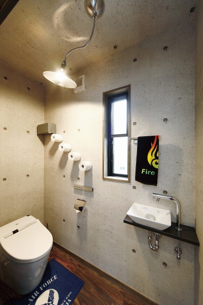 トイレの床も無垢のローズウッド。照明もペーパーホルダーも妥協なく好みのものに