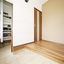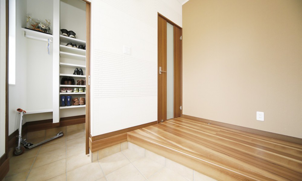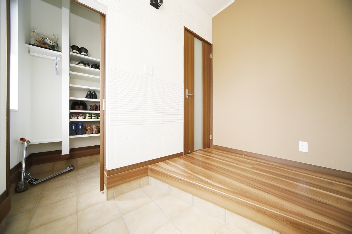 シューズクロークを配置した玄関はいつでもスッキリ・キレイ。アクセントのエコカラットも配置にこだわった