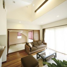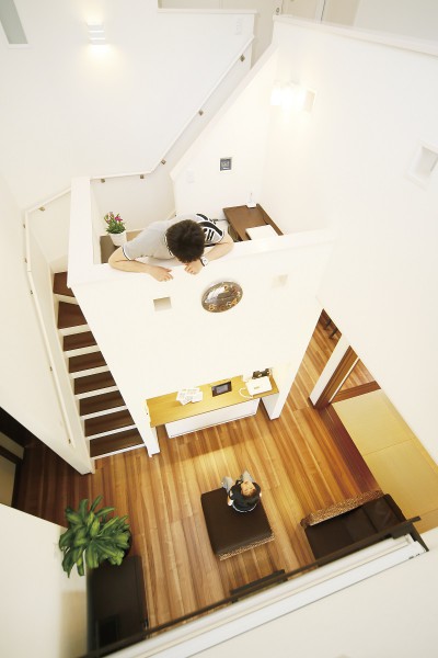 リビングの上に広がる吹き抜けが、抜群の開放感を与え、間取り以上の広がりをもたらす
