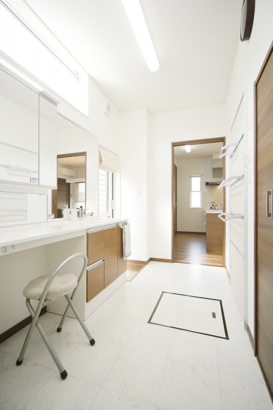 キッチンまで一直線の洗面室。北の配置にもかかわらず採光窓で明るい
