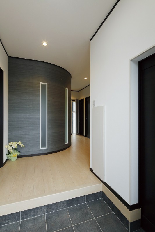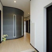 玄関は展示場でみた曲線の壁をとりいれ、シューズクロークは家族が多いので作って正解でした