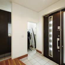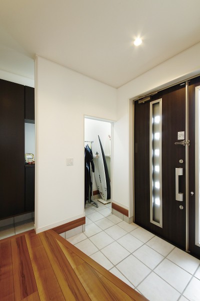 玄関の収納スペースの一部はサーフボード置き場。家族用玄関があるので玄関はすっきり