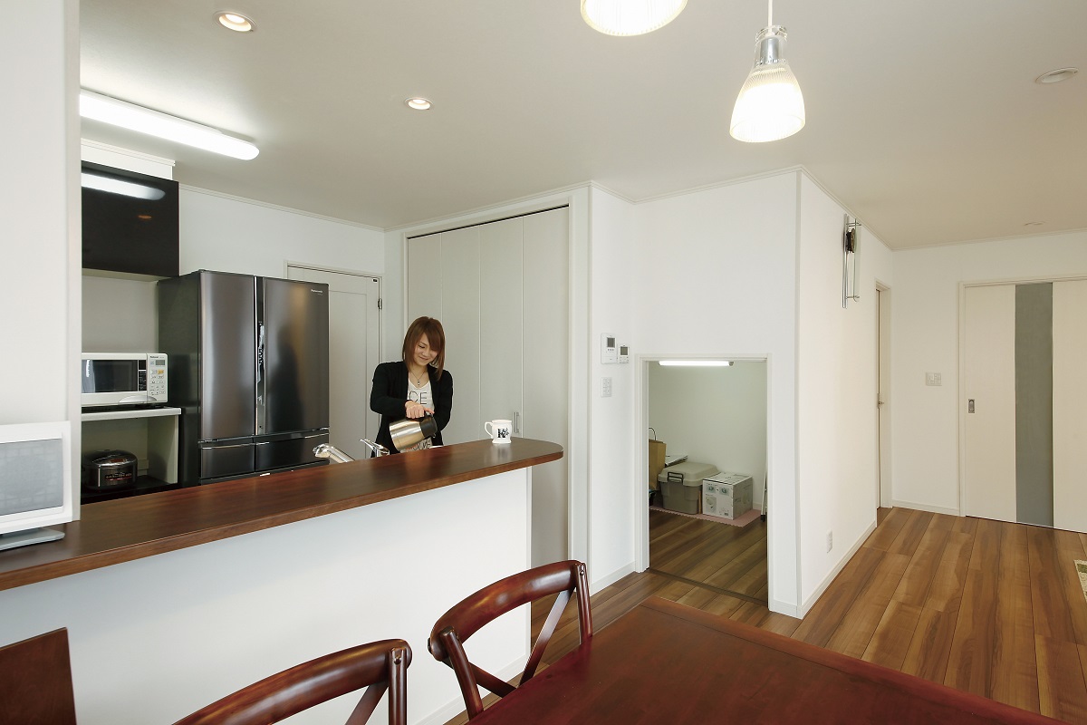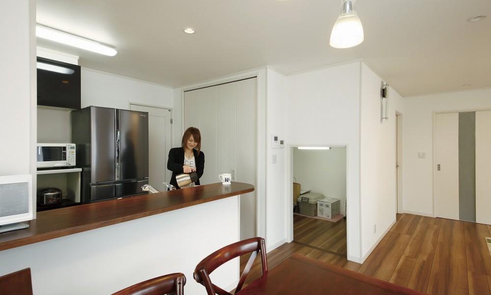 「キッチンのカウンターはカフェのようで気に入っています」とご夫妻。キッチン、ダイニングに隣接した小部屋は将来的にはキッズルームとして利用する予定