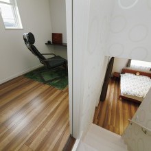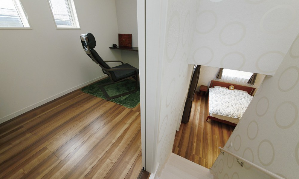 スキップフロアを活用したご主人用の書斎。寝室を通るため、夫婦が互いに気配を感じる