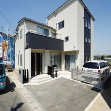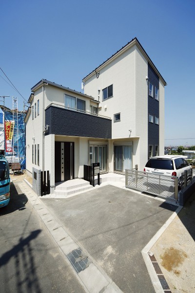 シンプルモダンなイメージの外観デザイン。スキップフロアを効果的に使った2階建て