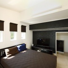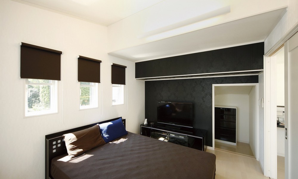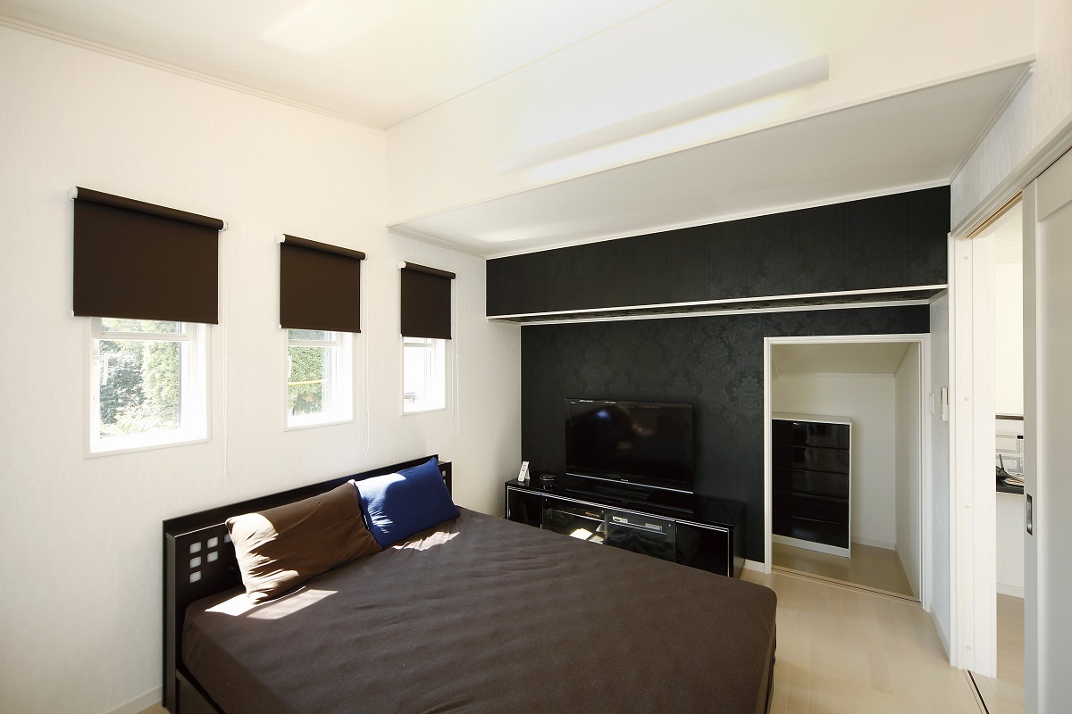 シックに仕上げた主寝室。奥のスキップフロアを利用して大型のクローゼットも設置