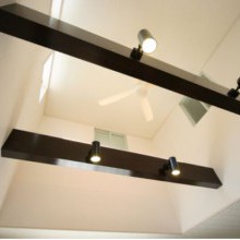 吹き抜け、現しの梁はモデルハウスで一目ぼれしたデザイン。吹き抜け上部にも窓を配置し、 多方向から光が差し込んでくる。家族がいつも集まる場所は、やはりこのリビングルーム