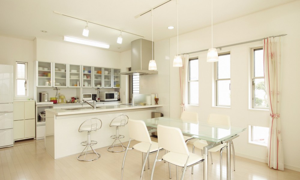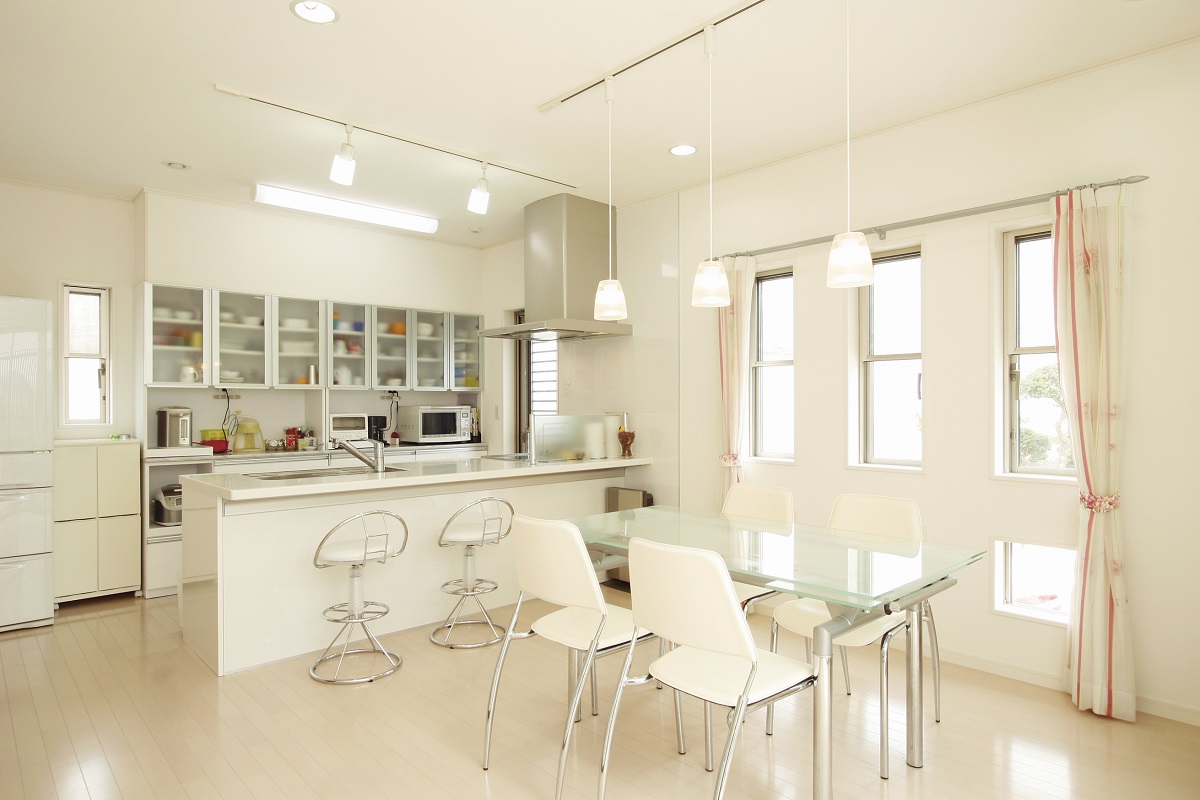 オープンスタイルを採用した、明るく使い勝手のいいキッチン。スケルトン収納は大工の造り付け