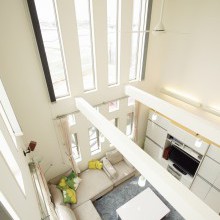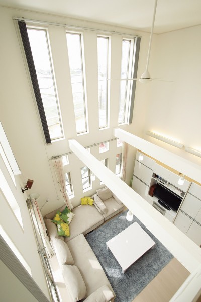6m以上の高さを誇るダイナミックな吹き抜けのリビング。南側のスリット窓が上下連窓で設けられ、光と風が心地よい空間を構成している。