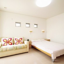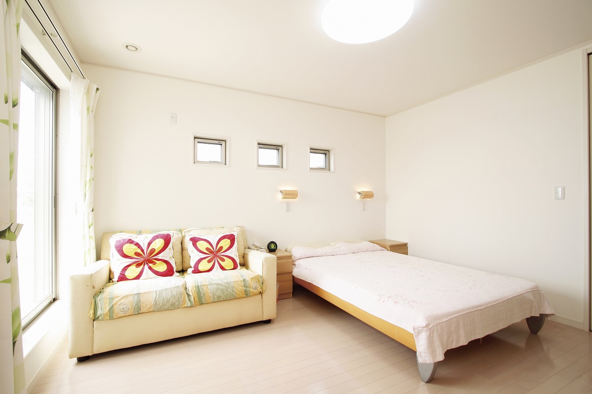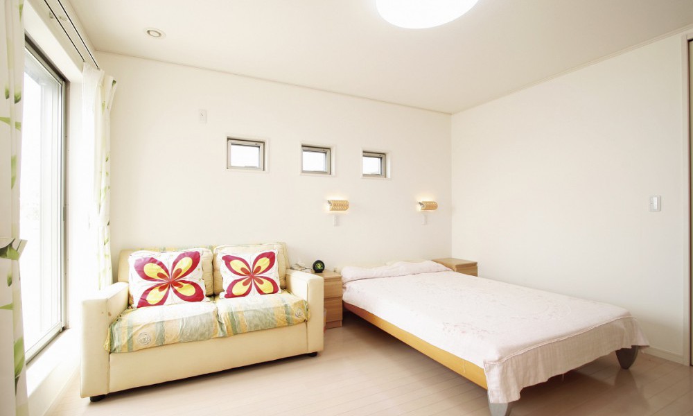 3つの小窓がアクセントな落ち着いた寝室