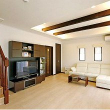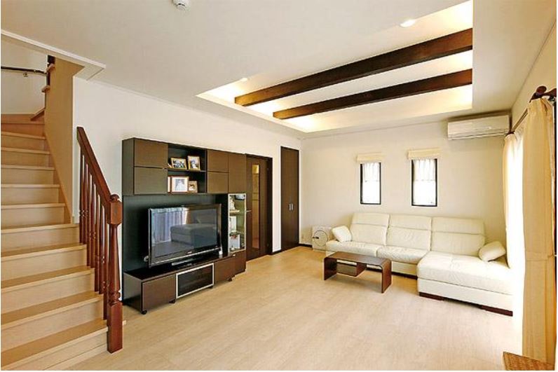 1階はリビング、ダイニング、キッチン、階段がひとつにつながるようにプランニング。折り上げ天井に付けた梁や間接照明はワールドハウスからの提案。「夜は雰囲気があってとても居心地がいいんですよ」とTさん。階段壁面に貼ったエコカラットタイルはTさんのこだわり