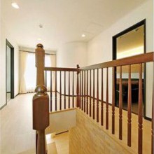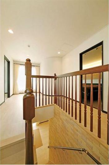 階段や上階ホールにも広がりを感じられるよう、壁を取り払いすべて木製の手すりを採用