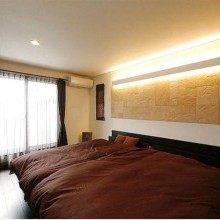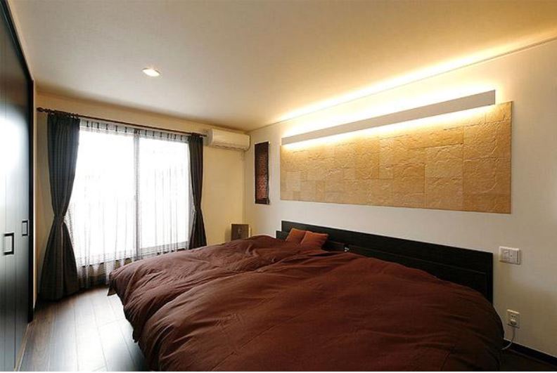 間接照明とエコカラットが雰囲気をつくる落ち着いた寝室