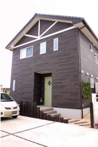 玄関ドアと外壁サイディングを木目調で揃えて、あたたかな印象のエントランスに