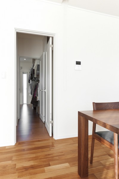 リビング隣の大型納戸は奥の寝室のウォークインクローゼットまで一直線。
