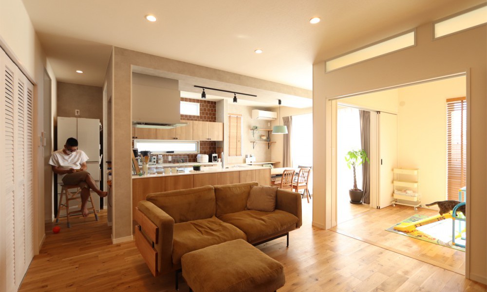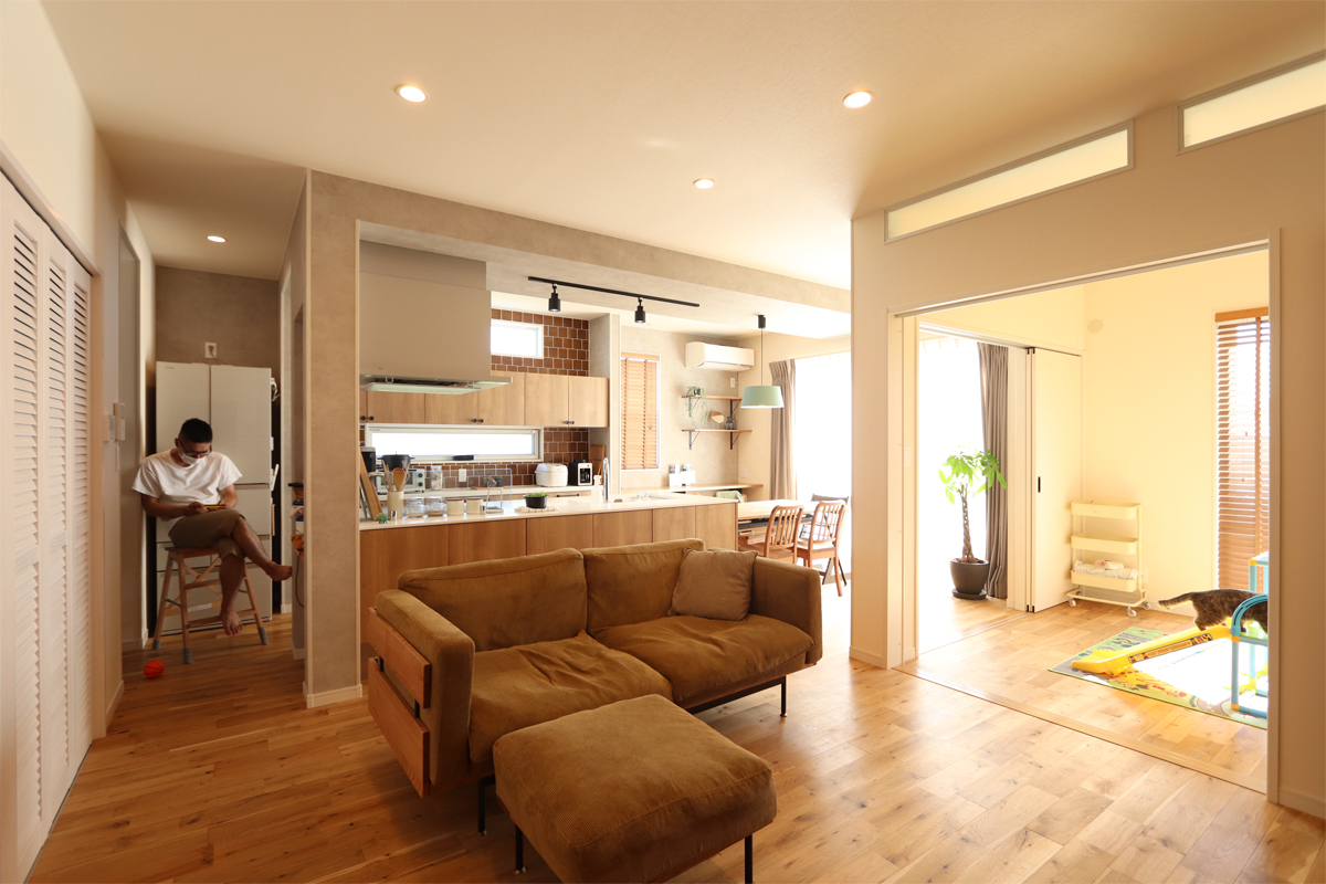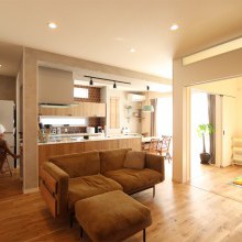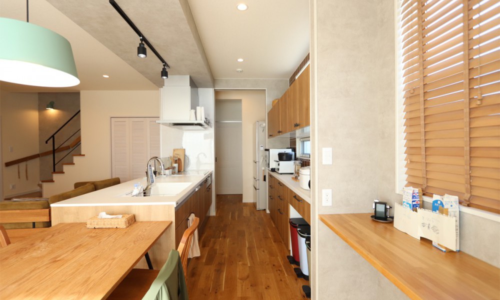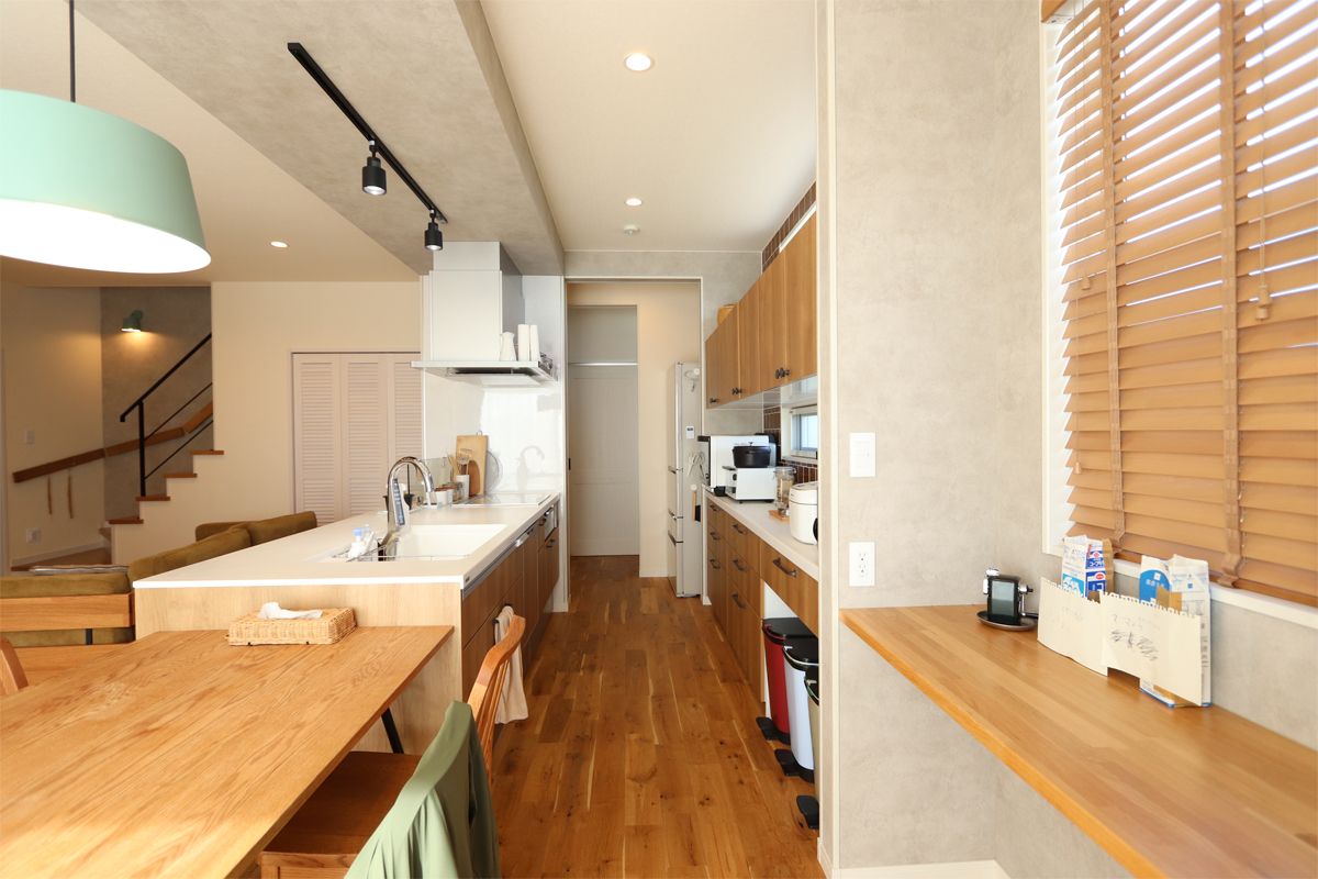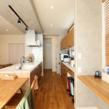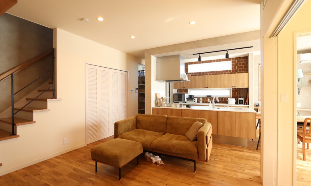 素足が喜ぶ気持ちの良い無垢フローリングと棚や手すりの無垢の質感が、LDK全体の柔らかな雰囲気を演出、落ち着いた自然体が似合う空間になりました。