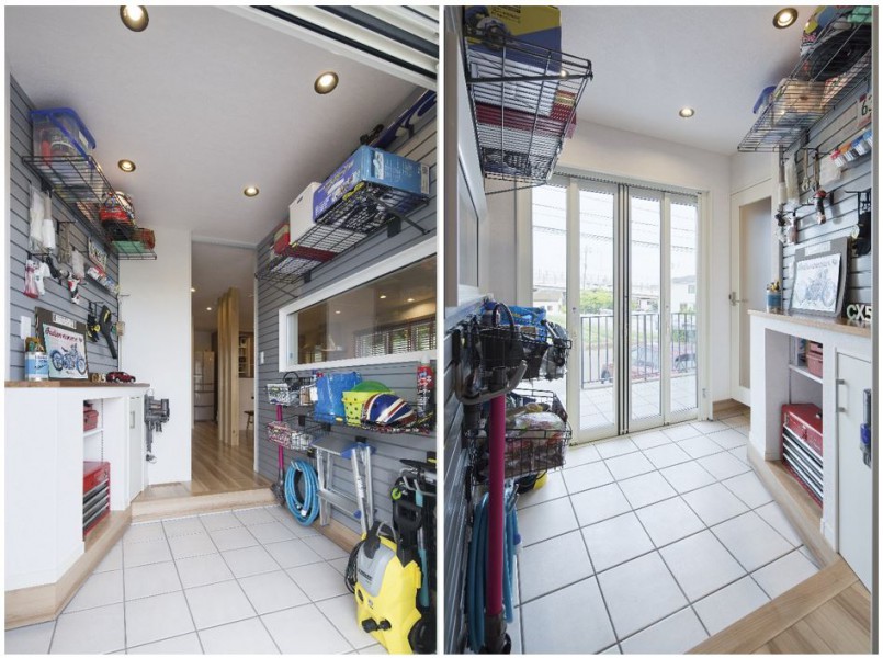 車庫スペースとしても活用できます。壁一面に工具やグッズを並べて、