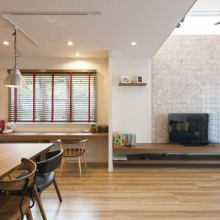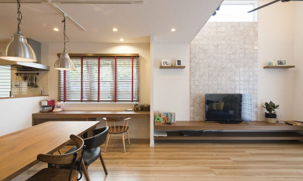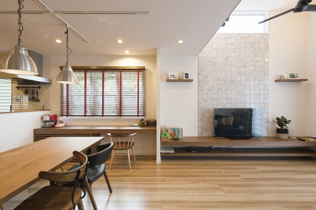 TV台の背面のタイル壁やウッドブラインド、家具・インテリアなどにもこだわりました。