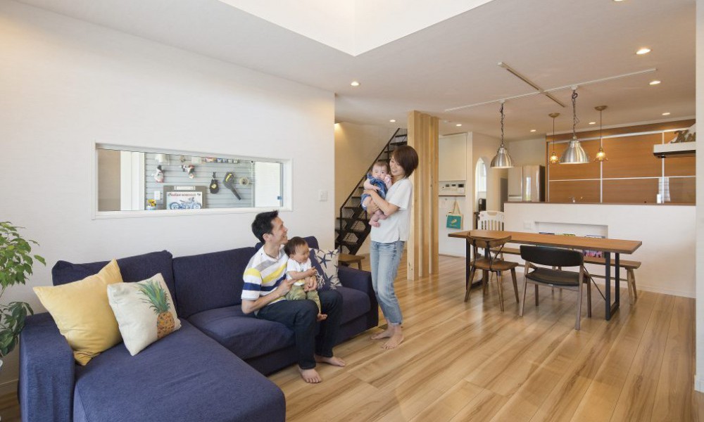リビングは、吹き抜けで明るく開放感を演出、いつでも土間スペースが見られるように窓を設置。