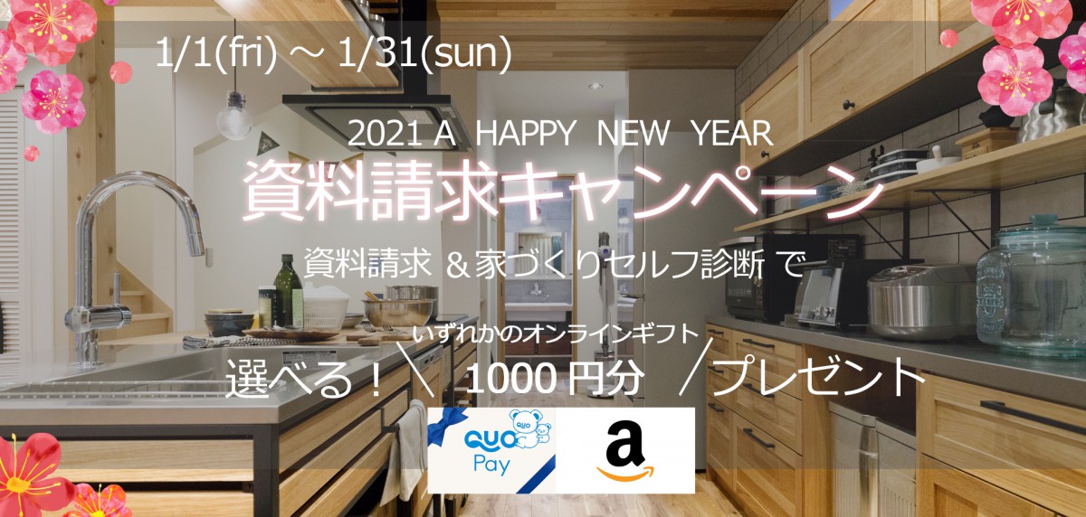 1月1日(金)~1月31日(日)の1ヶ月間限定!ワールドハウスのホームページから初めて資料請求&家づくりセルフ診断をされたお客様皆様にオンラインのクオカードペイまたはアマゾンギフト券1000円分プレゼントいたします!この機会に皆さん今年こそマイホームへの第一歩を踏み出してみませんか。
