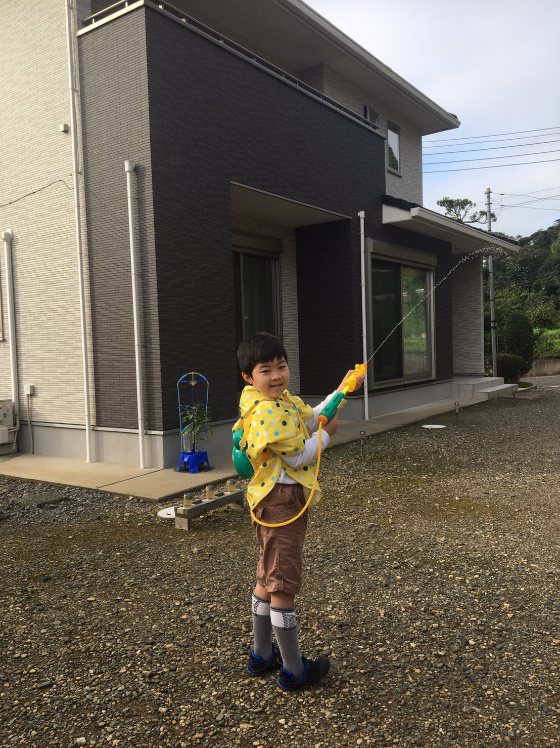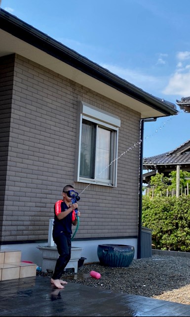 玄関前で水遊び。なぜかシュノーケルを装着。