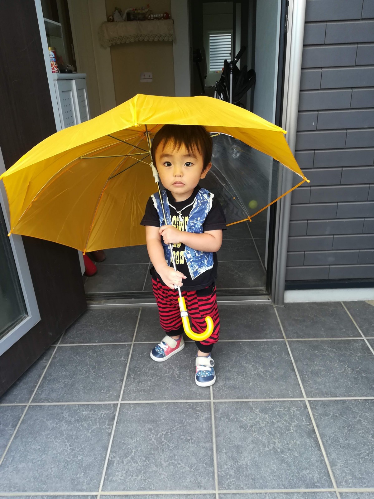 雨の中、お散歩に行きたいと兄の傘を持ちだし、連れて行って〜とおねだり中の一枚です。