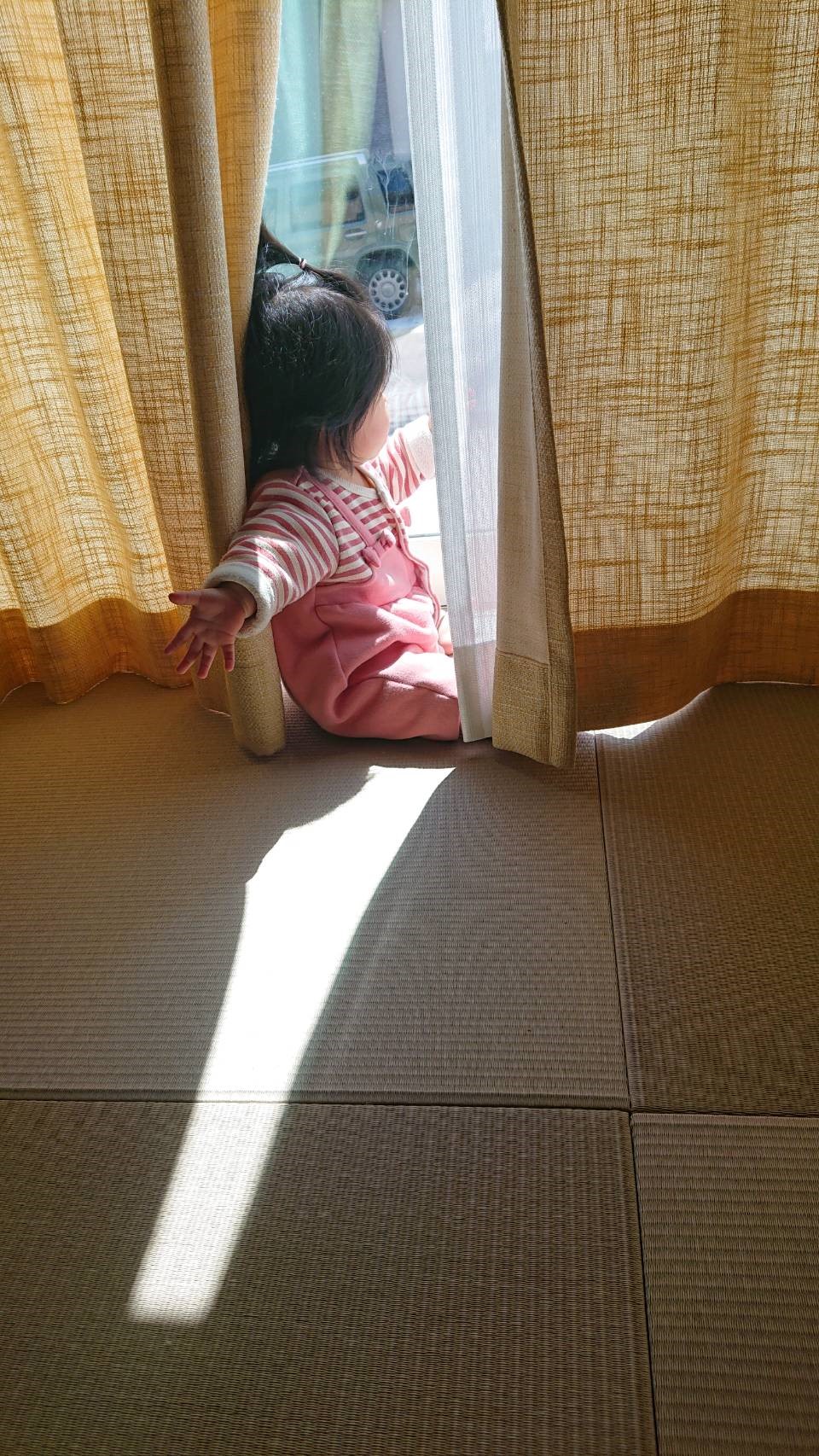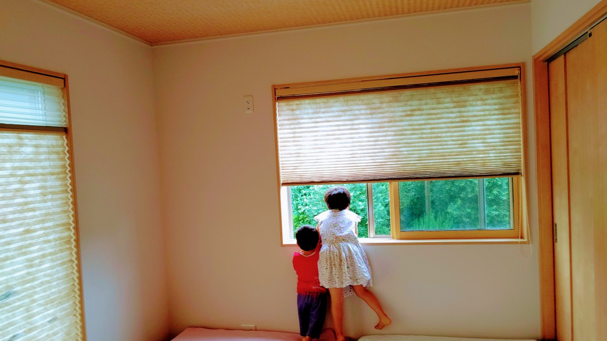 和室はおもちゃをたくさん使って遊んだり、お昼寝スペースにしたり、大活躍です。外を見るのも兄妹で楽しんでいます。