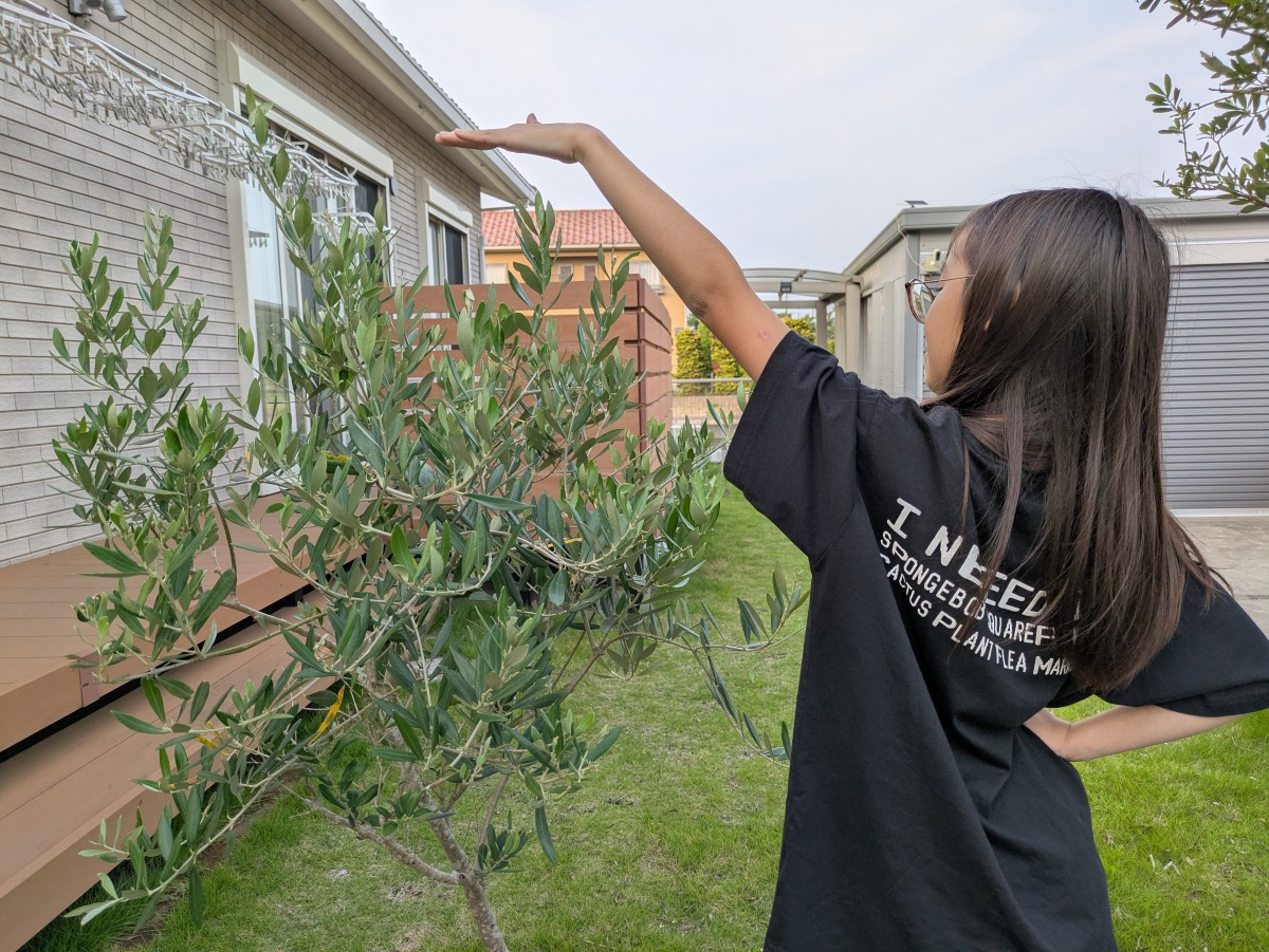 小さかった庭のオリーブがぐんぐん伸びて娘の身長を超えてしまいました。夏が終わる頃には見上げるくらいになっているかも。