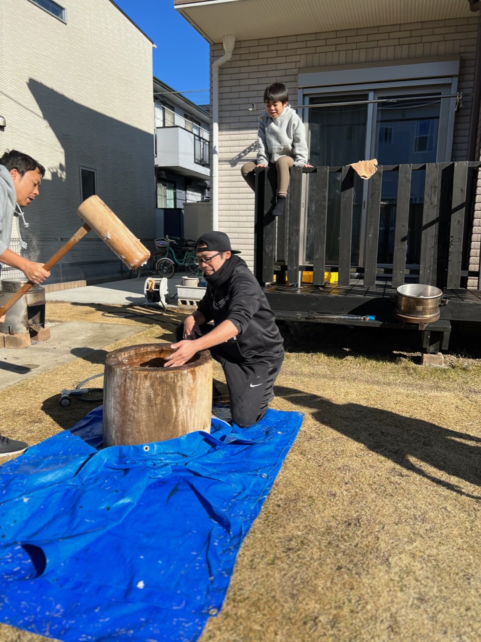 お家の前でお餅つき