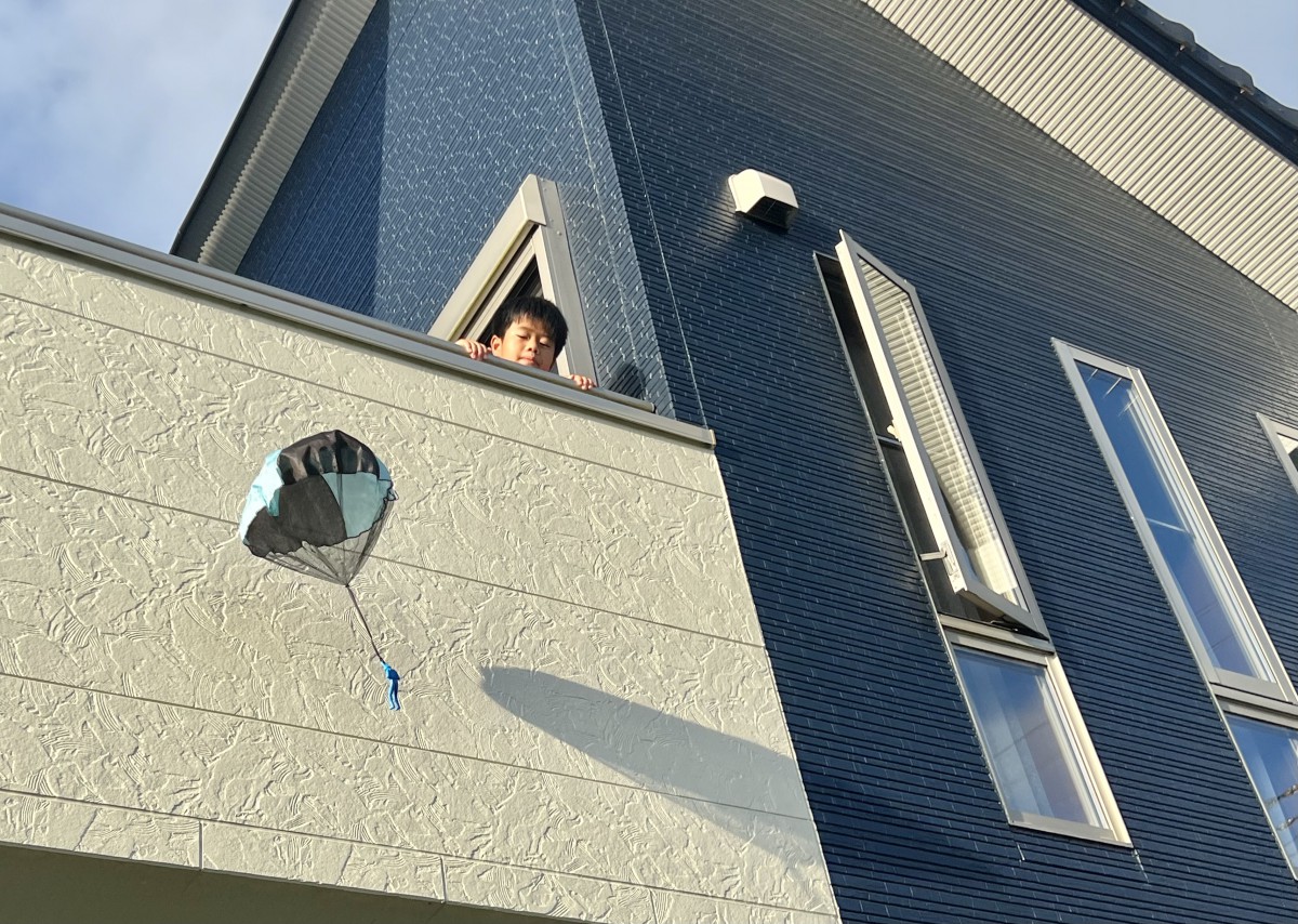 ベランダから、パラシュート。どこに着陸するのかなぁ。、