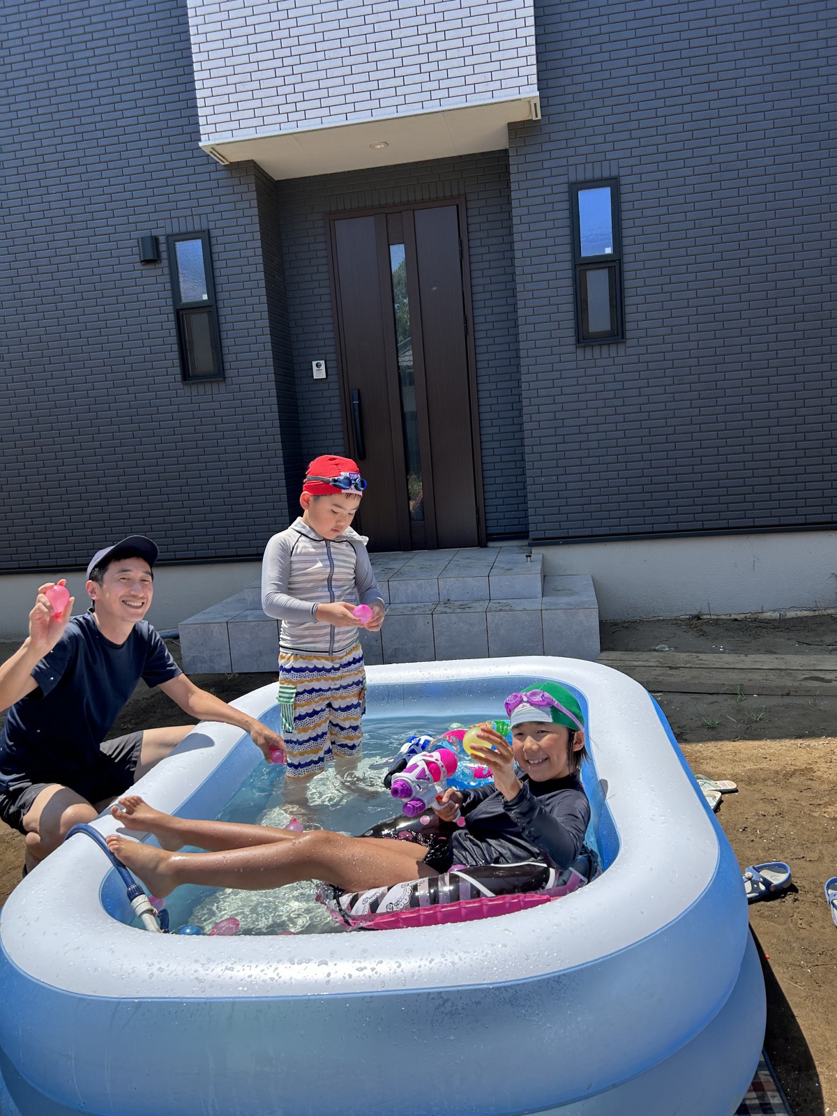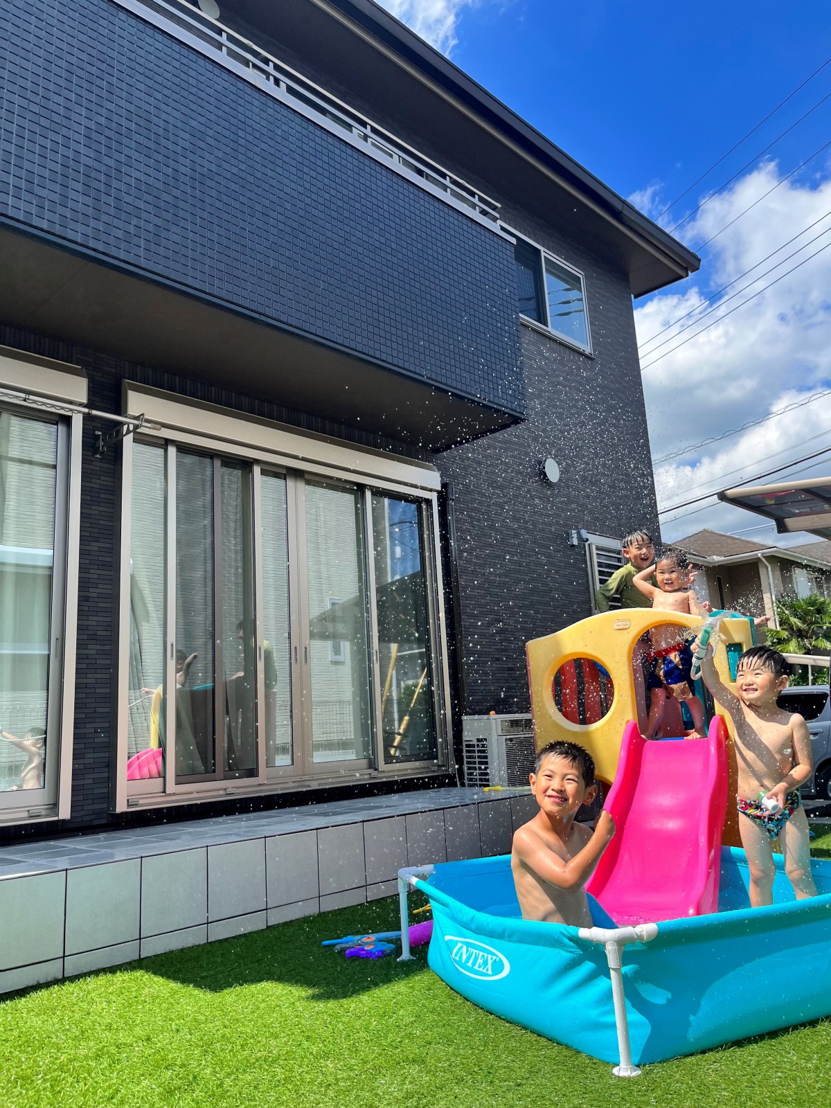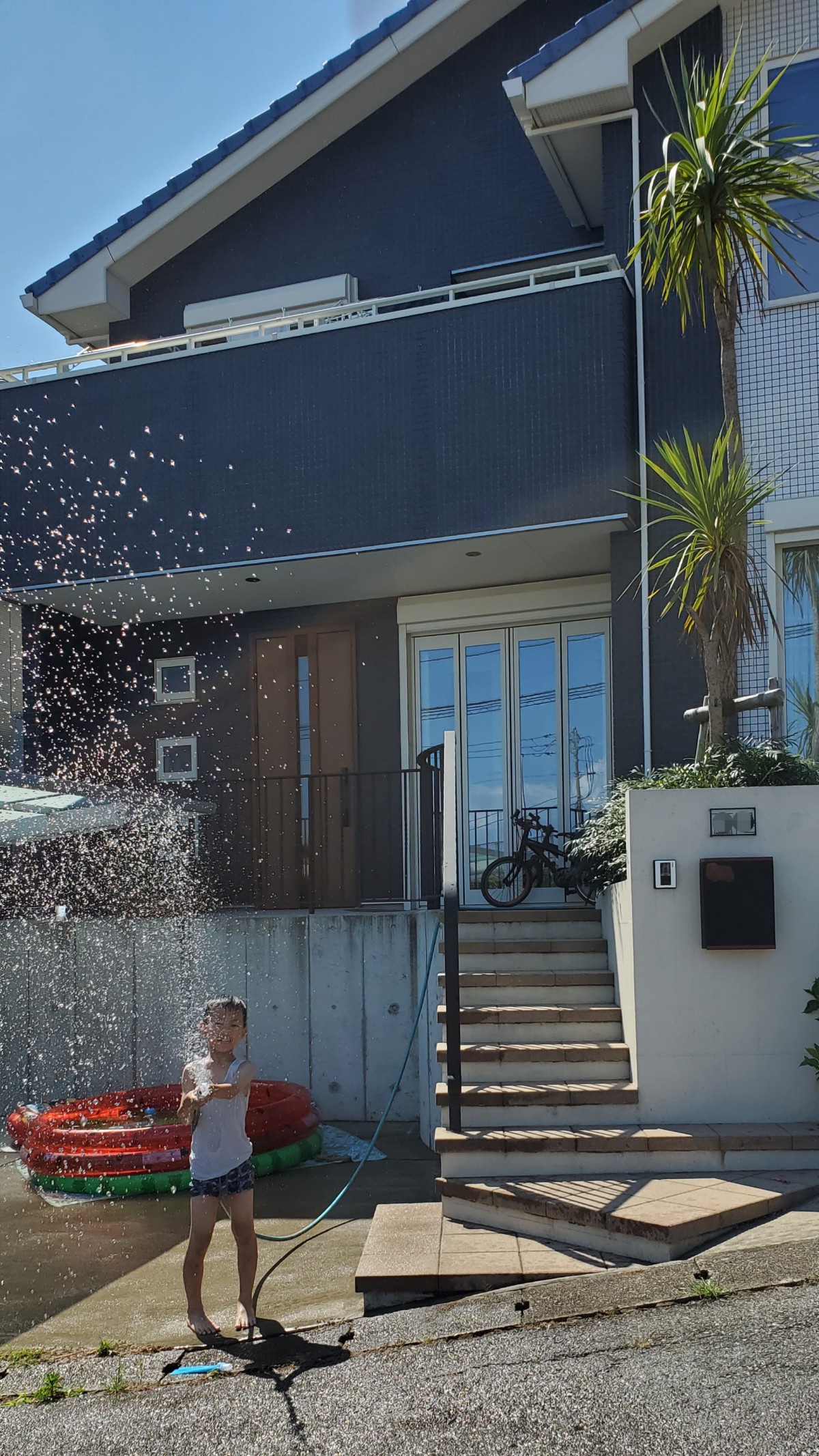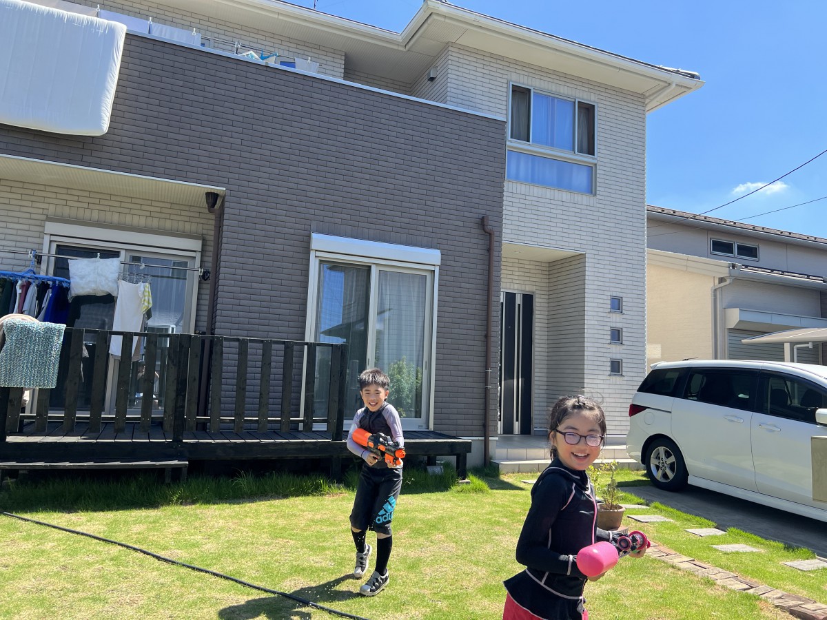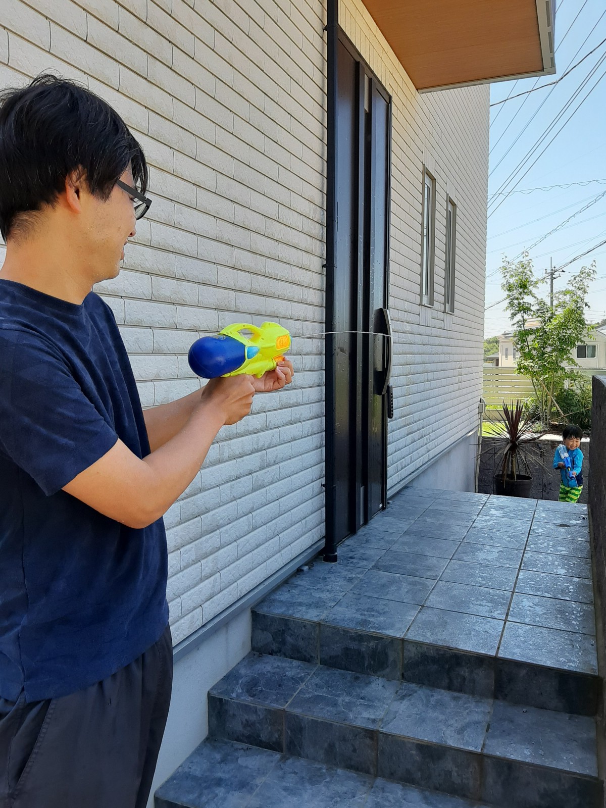 夏のはじまり、プールを出すほどでもないが水遊びをしたいという休日。パパと息子の水鉄砲対決!パパも息子も壁に隠れたりしながらも対面勝負!息子が去年よりも隠れて狙うのが上手くなり成長を感じました。玄関前はすっかりびちょびちょです(^.^)