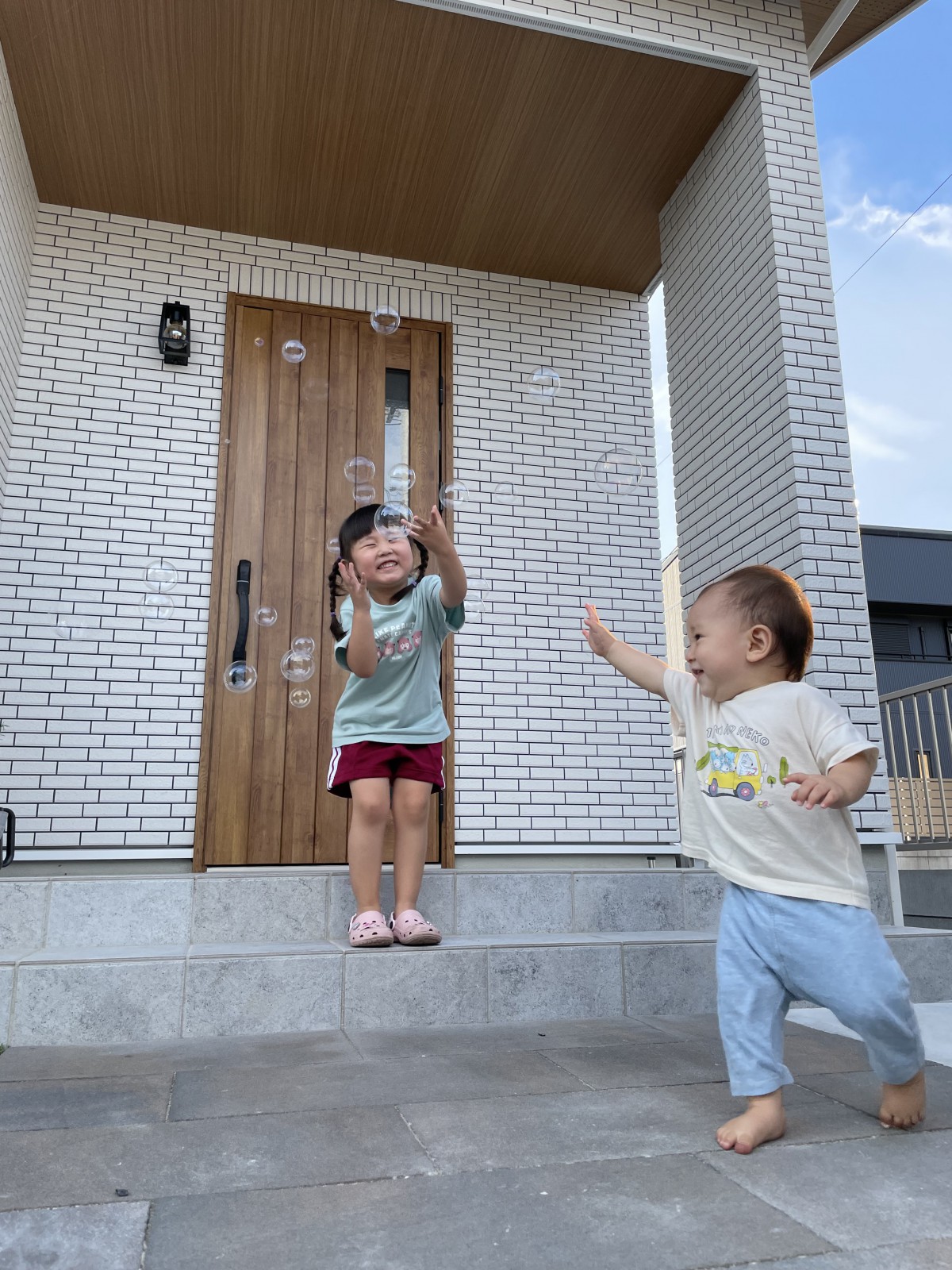 猛暑で日中の外遊びは出来ませんが、涼しくなった夕方に玄関ポーチでシャボン玉をしました。やっぱり外遊びが大好きです!
