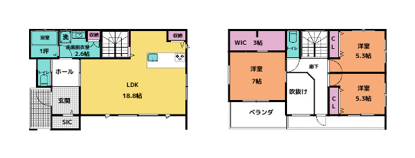 3LDK(洋 5.3帖、5.3帖、7帖 LDK 18.8帖 )